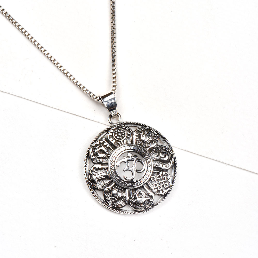 Show your spiritual side with this 92.5 Sterling Silver Pendant with sacred aum symbol in the centre and other symbols in the outer most ring that spreads peace and tranquility .Wear it when you feel low or depressed this pendant gives you security and strength. Anniversary, Birthday gift , Anniversary gift , first date gift, Souvenir for your family and friends.