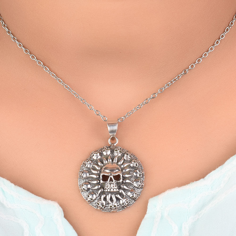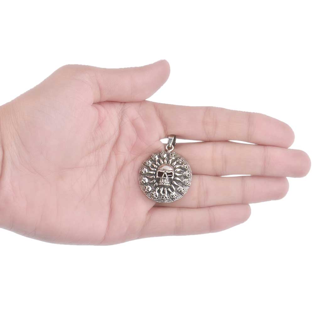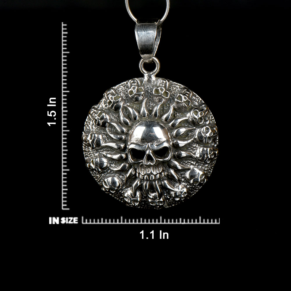 92.5 Sterling Silver pendant with Human circle of skulls with a skull in center and many tiny cells in circular frame makes this pendant an extraordinary piece for someone who loves thrill adventure in life and want to be the centre of attention . It is a perfect piece for any occasion or social gathering. Ideal gifts for your girlfriend, wife, mom and daughter and treat yourself or someone special to it.