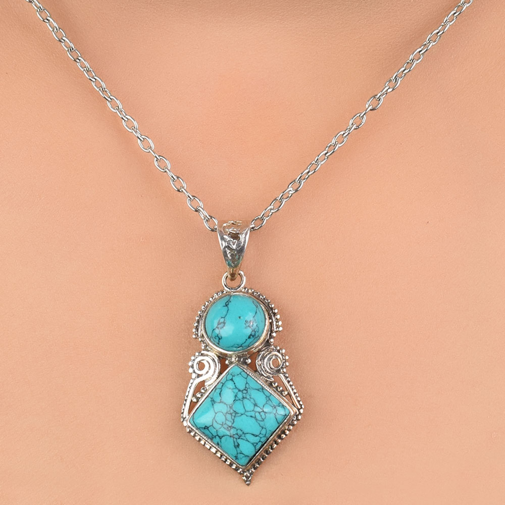 Handmade by the Indian artisans the unique turquoise stone tiered design allows the pendant to move with you and shine elegant in the light. This piece is the perfect size to make a statement, while still being comfortable enough for everyday wear. Ideal for gifting and perfect for everyday or that special night out.