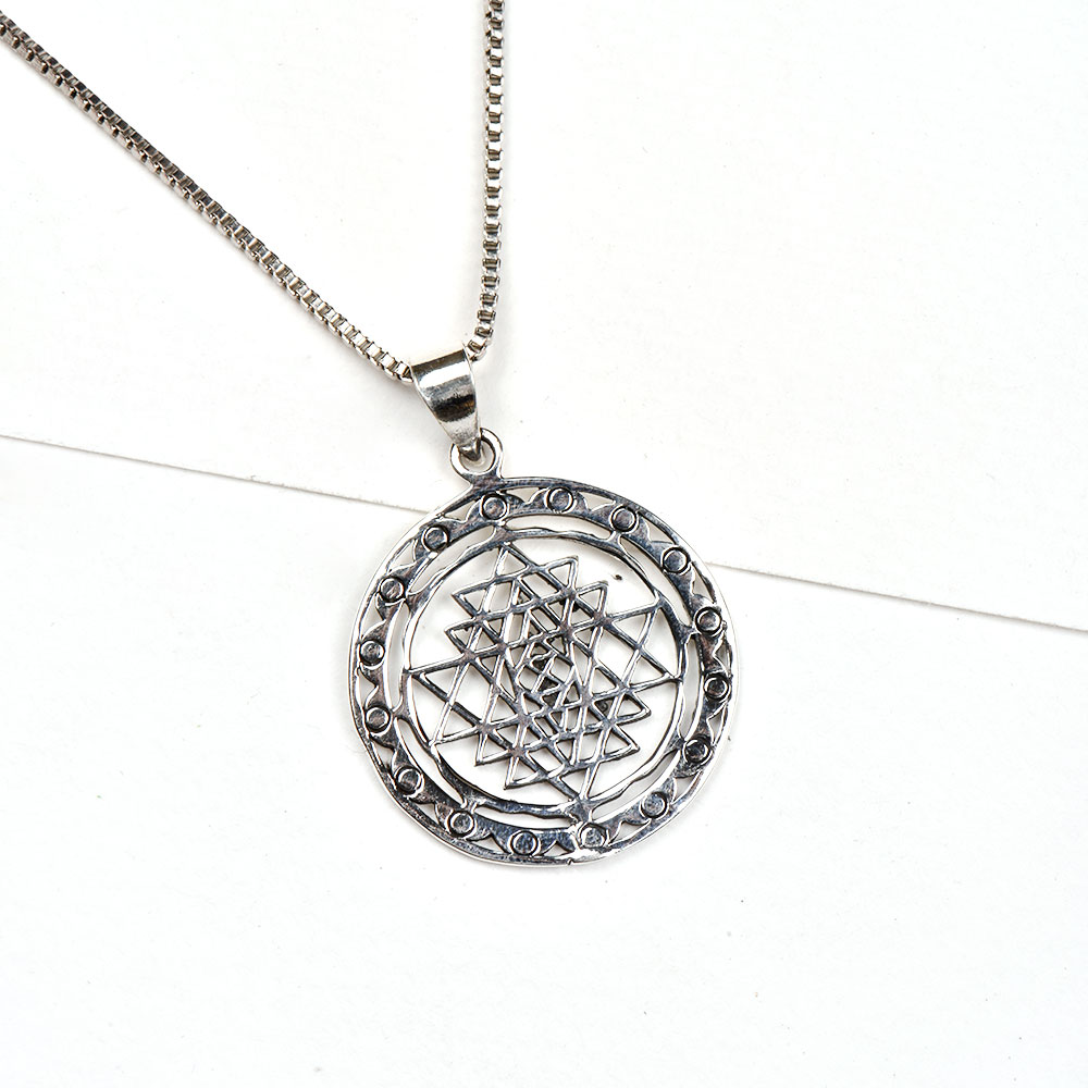 Very auspicious hand crafted 92.5 sterling silver pendant with small triangles shri yantra design inside the circle. It can be worn with traditional as well as modern outfit . Gift it to our friends, mother on Diwali, Anniversaries, graduation, ring ceremony, school functions etc.