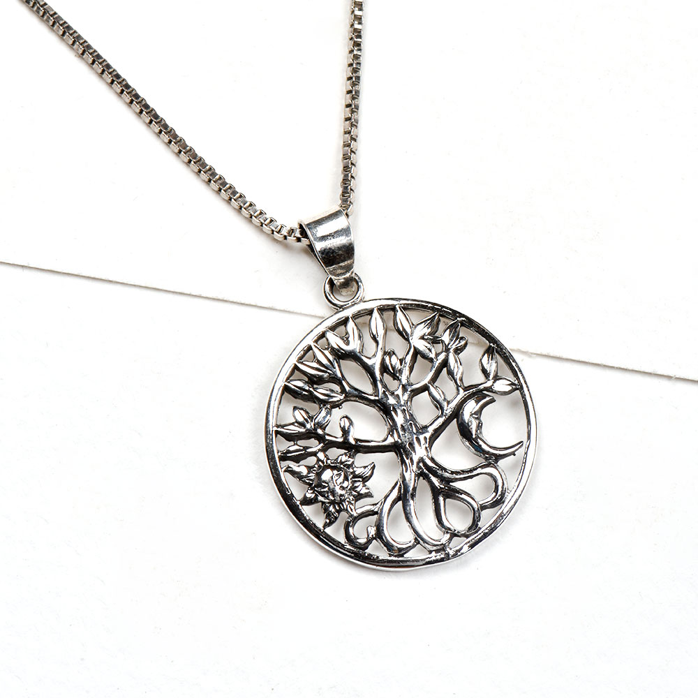 These handmade Sterling Silver Pendant shows the tree of life with branches on the top and the roots below with a crescent moon and a sun figurine on the opposite sides of the tree of life. A very thoughtful present for your wife ,sister, daughter or that special person who will soon enter youth family. It can be gifted during Christmas, anniversary, valentine and Black Fridays well.