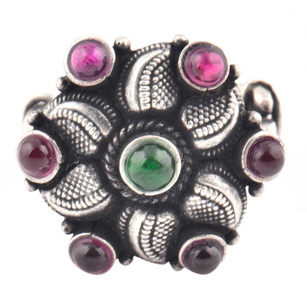 A very regal looking 92.5 Sterling Silver Ring hand crafted by the master craftsmen of India has a lovely leafy flower with amethyst and onyx stone in oxidized silver metal .It suits all kinds of traditional wear and is the perfect gift for your sister, wife, mother, friend colleague or other family members.