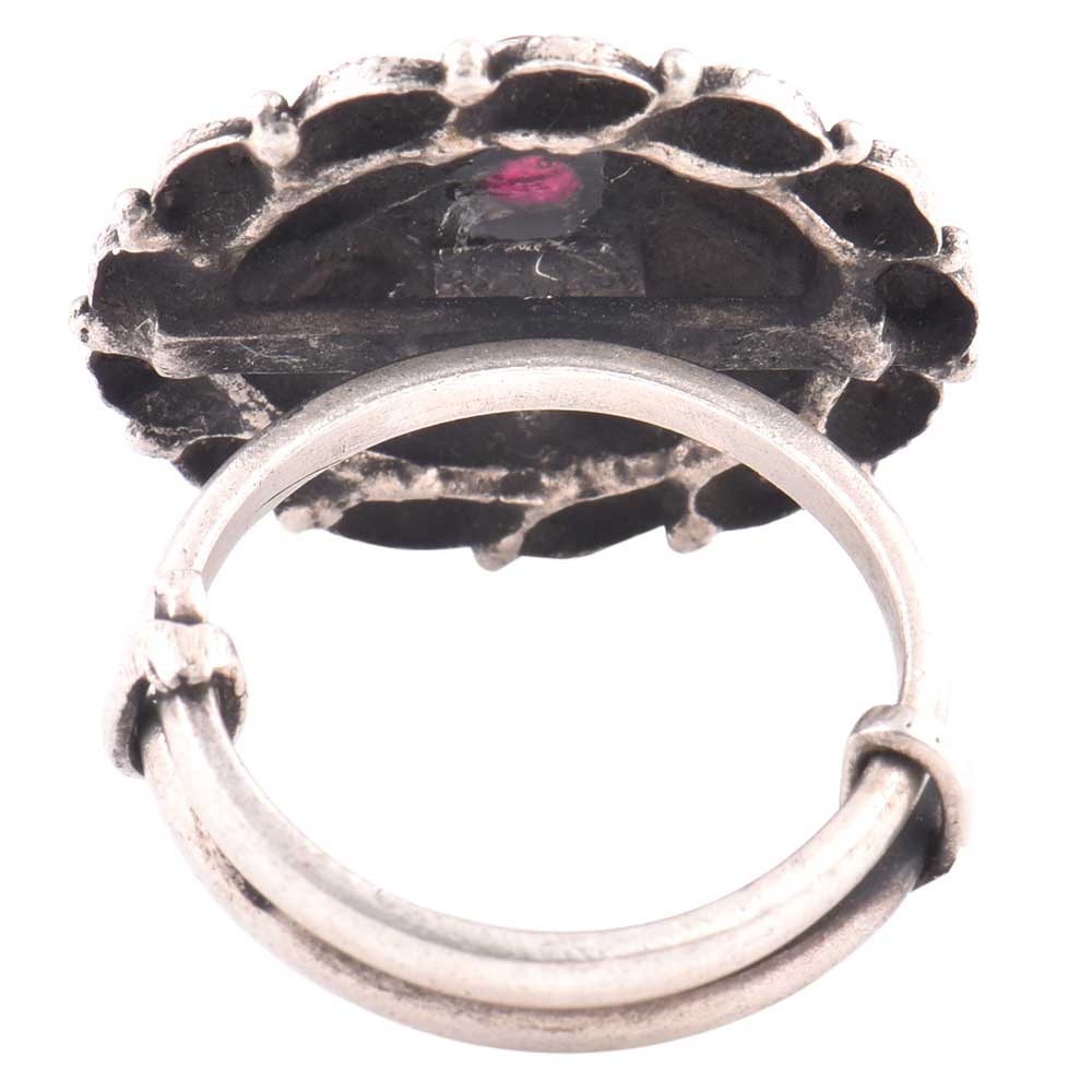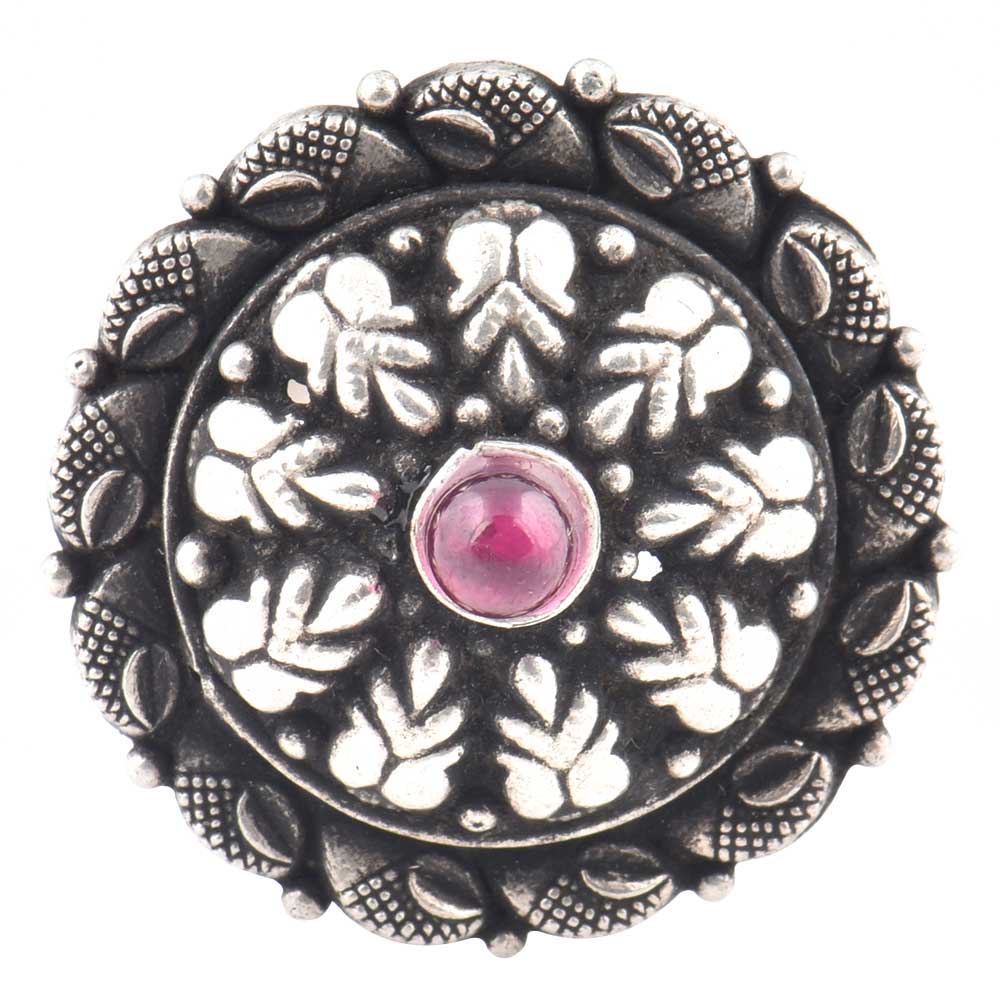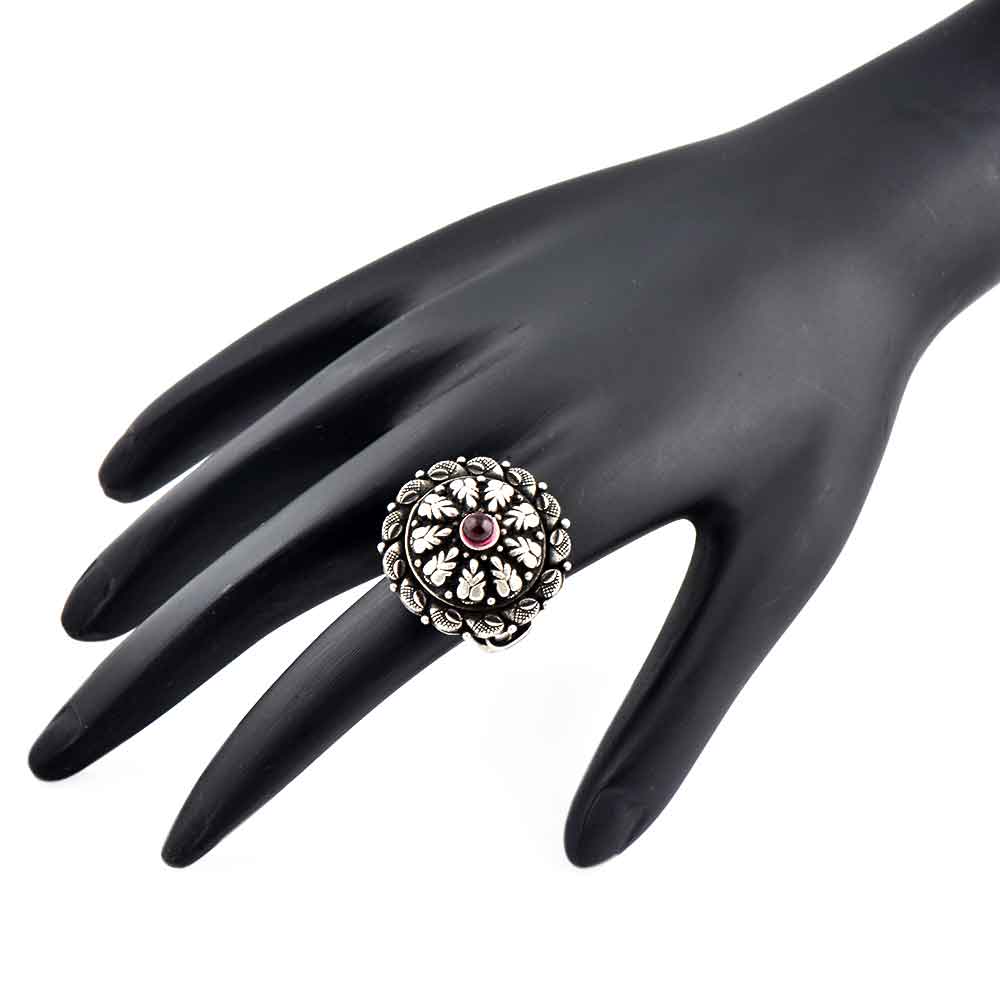Classy handmade 92.5 Sterling silver ring has a round amethyst with embossed leaf pattern in the central ring whereas the other has embossed traditional motifs surrounding the stone. The ring can be adjusted according to the size of your finger. Wear it to a traditional wedding, cocktail party, official or social gathering, as a gift to your sister, mother, wife and the special friend.