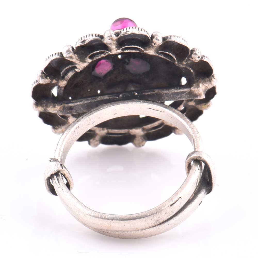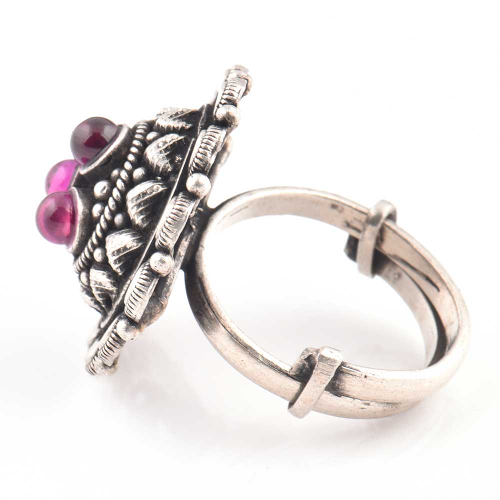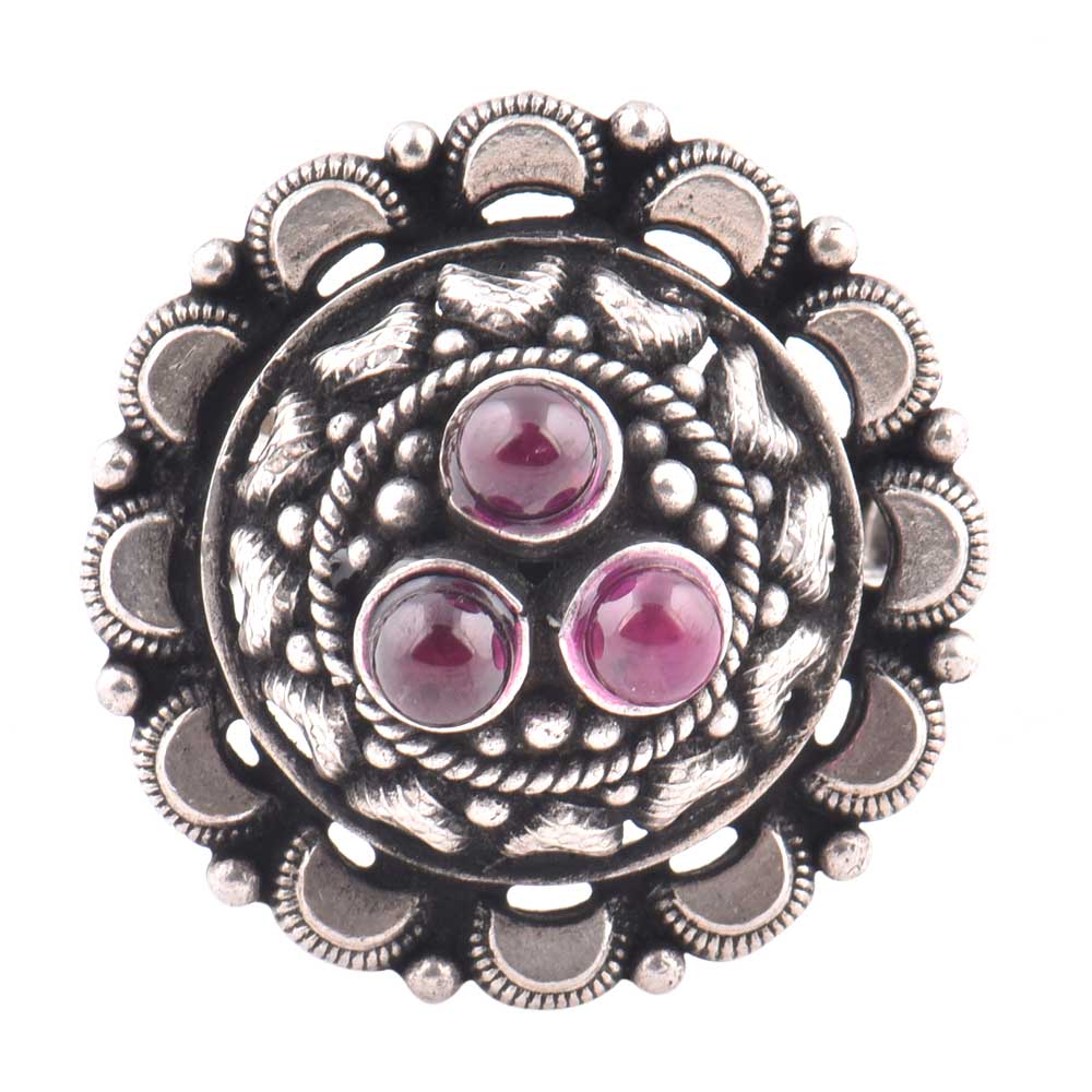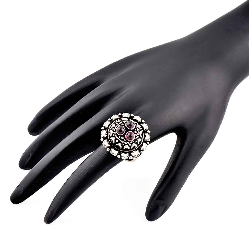 This 92.5 Sterling silver ring is made in typical south Indian style with embossed pattern and motifs with three amethyst stones in a floral pattern. It looks good when paired with traditional or western outfits. As it is adjustable it can be gifted to girls or women of all age group.