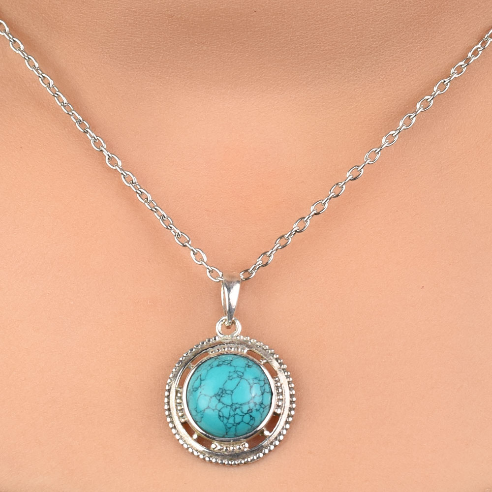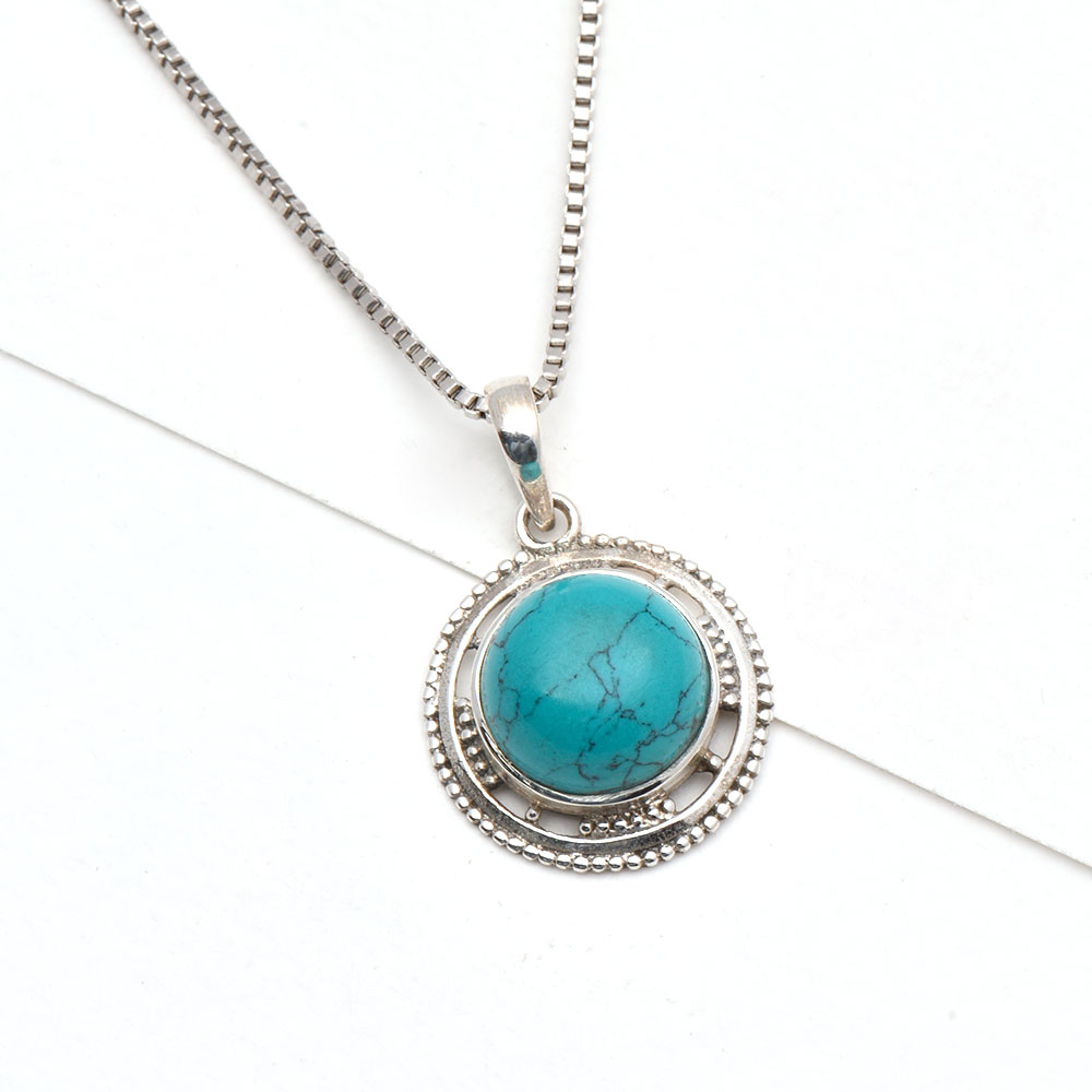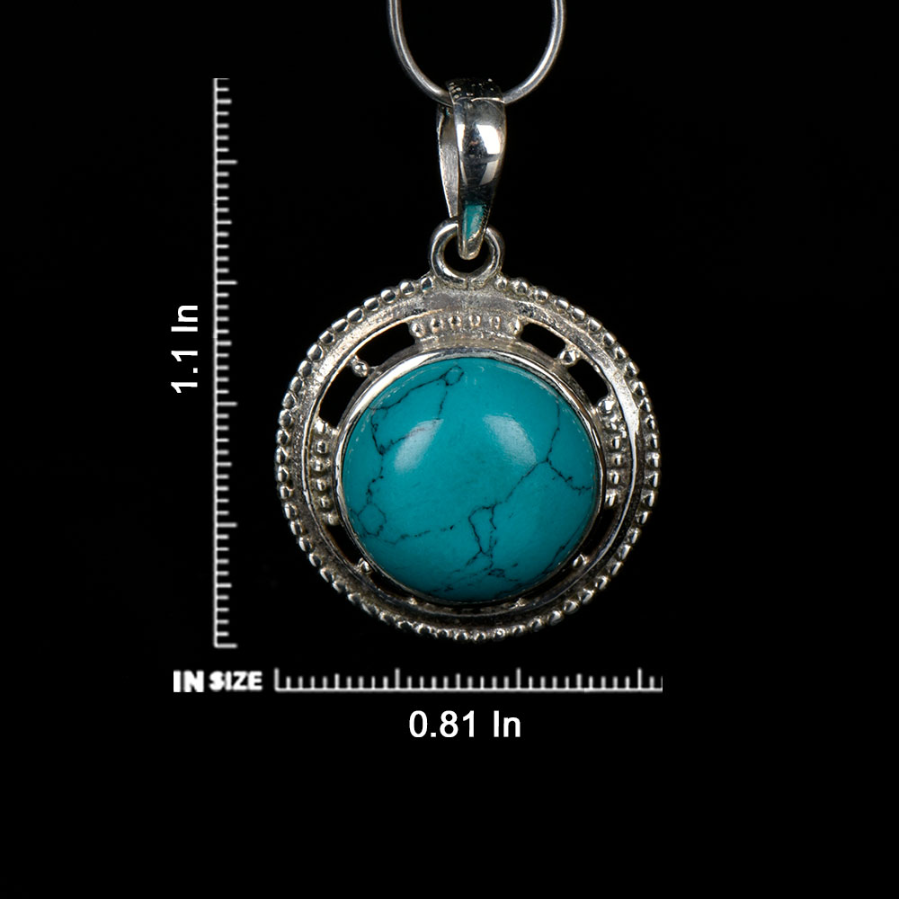 Natural turquoise is set in an intricately engraved sterling silver circular bezel setting is ideal for gifting and perfect for everyday or that special night out.