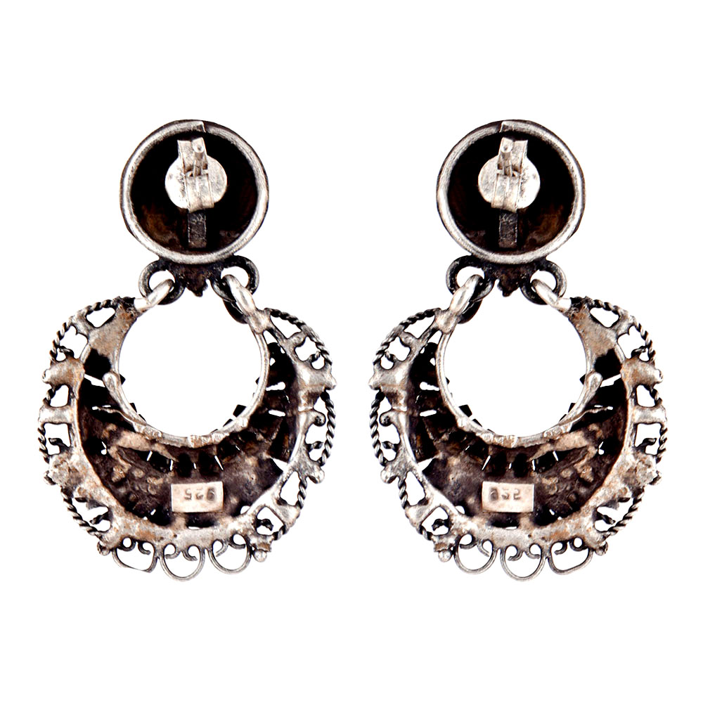 Evergreen Chandballi 92.5 Sterling silver Earrings has a lovely round floral design on the stud and Chandbali hangings with stoned pattern and floral motifs with roped design on the end of the dangle earring. Ideal gift for yourself or your near and dear ones.