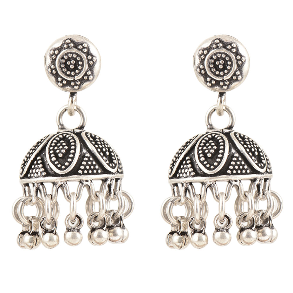 A unique looking 926 Sterling Silver Jhumkies Pair in Dome shape with floral motif on the top with hanging silver bells from our tribal jewellery collection can adorned beautifully with any Indian outfit. Ideal for Work And Casual Wear.