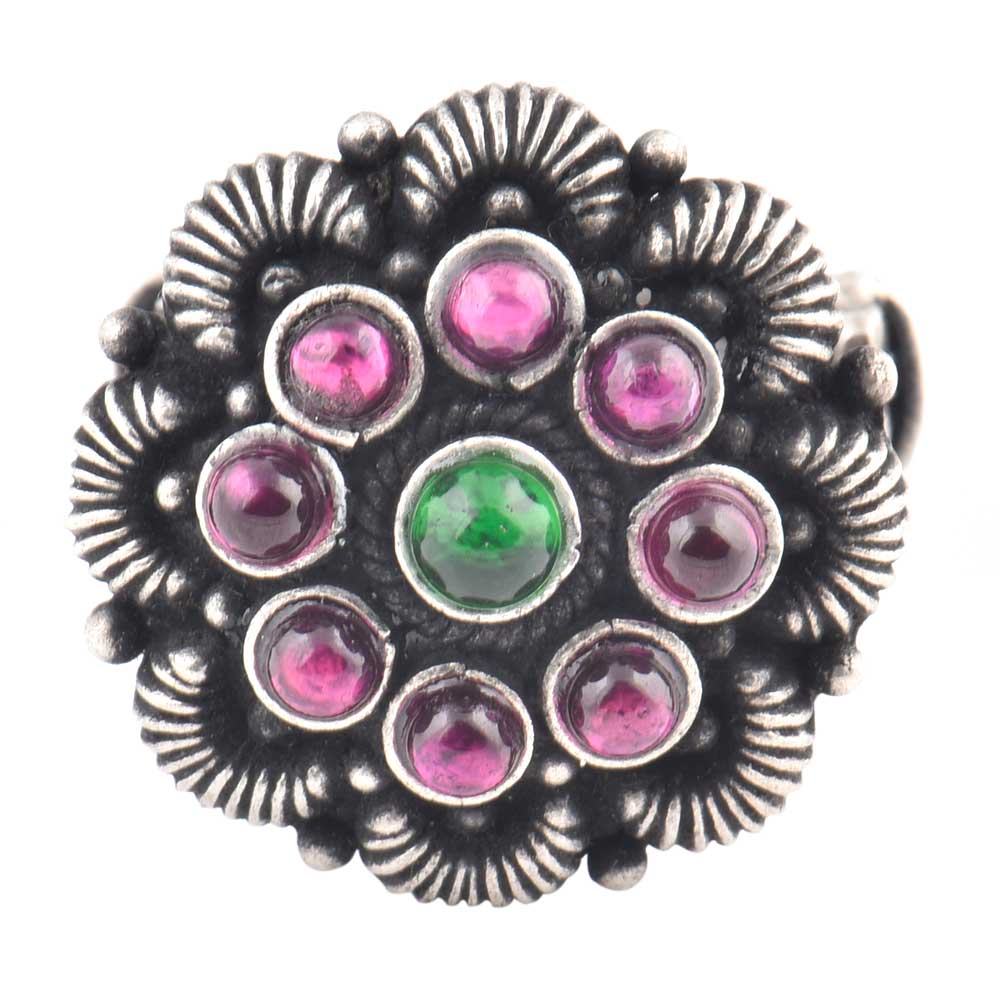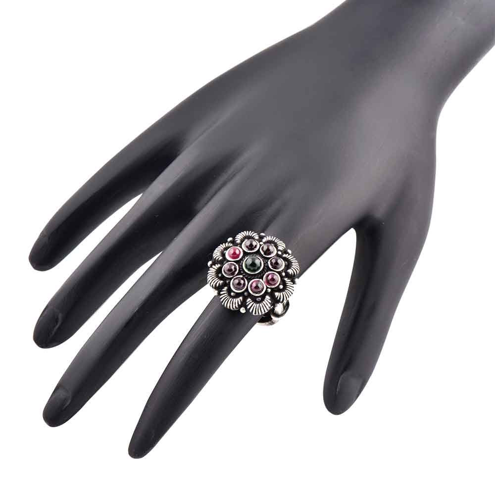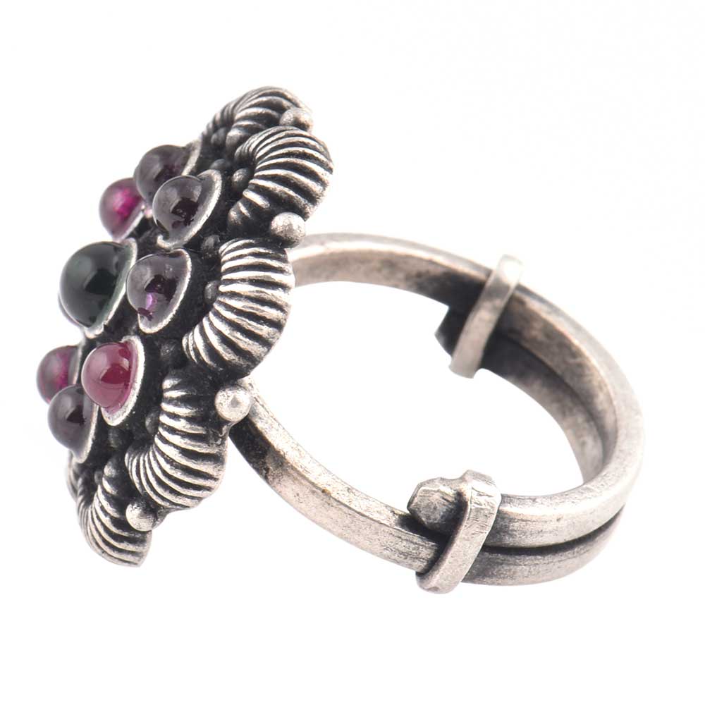 Exclusive party wear 92.5 Sterling Silver Ring adjusted according to your finger in floral petals and round amethyst and onyx stones fixed in the ring. Wear it for engagements, wedding, bridal shower, Diwali, New year and other religious functions and ceremonies . Ideal gift for sister, mother, wife and friend.