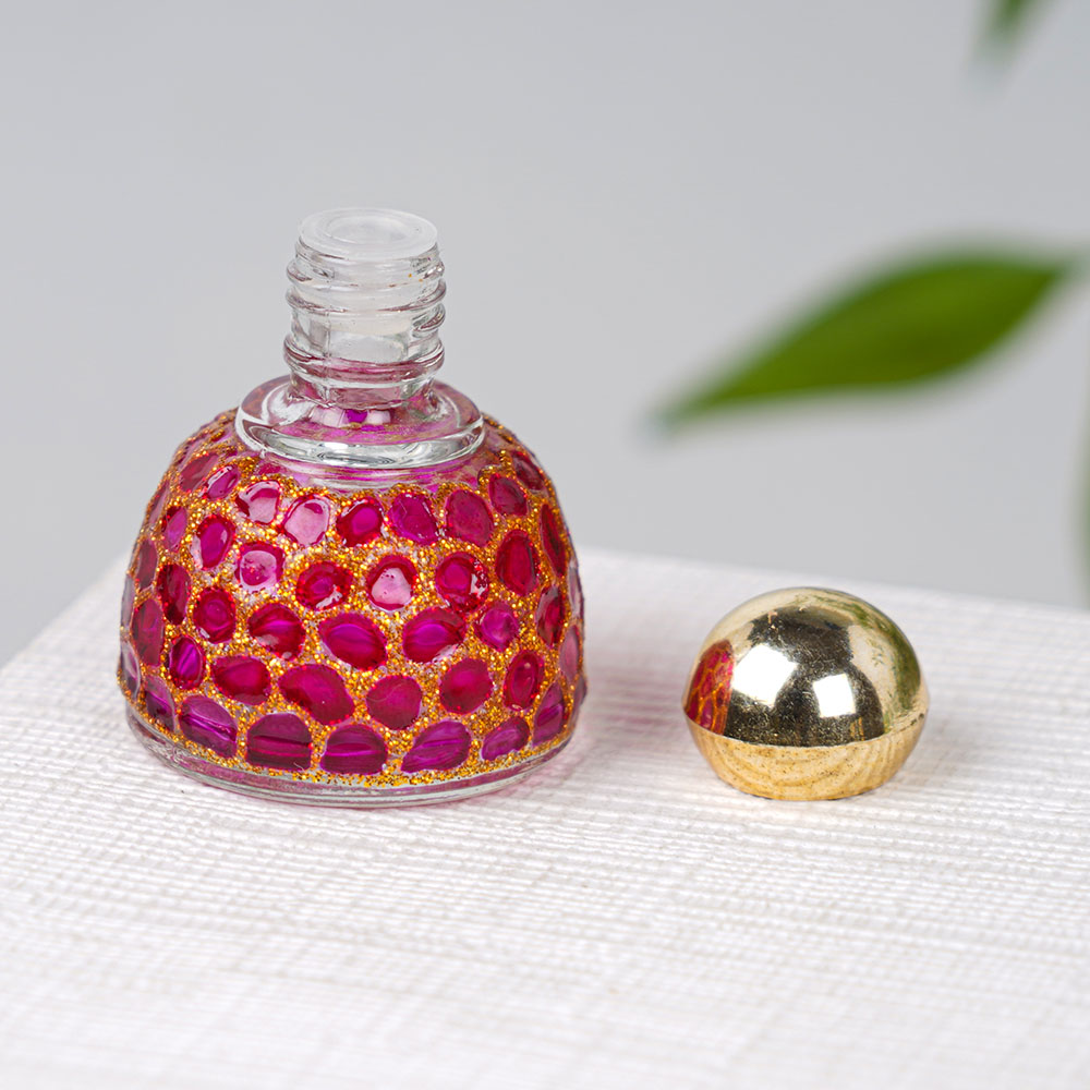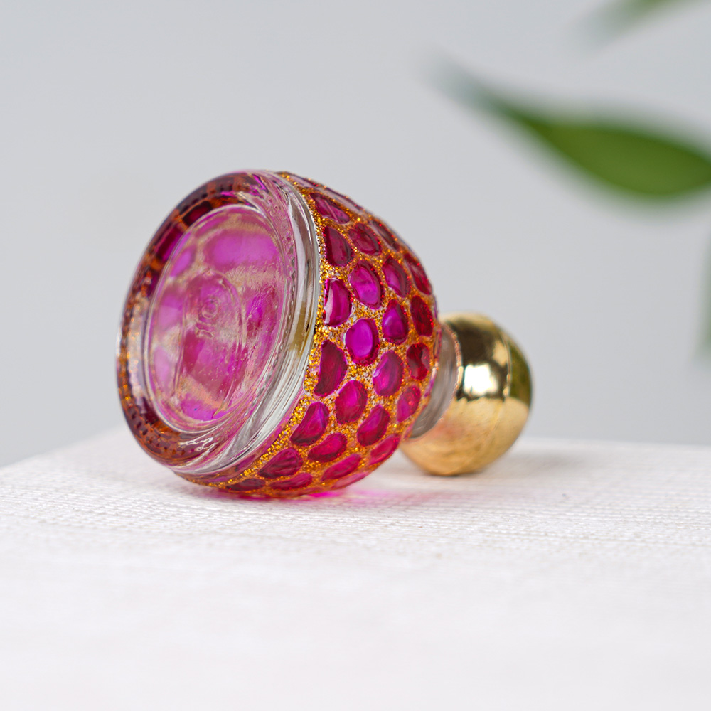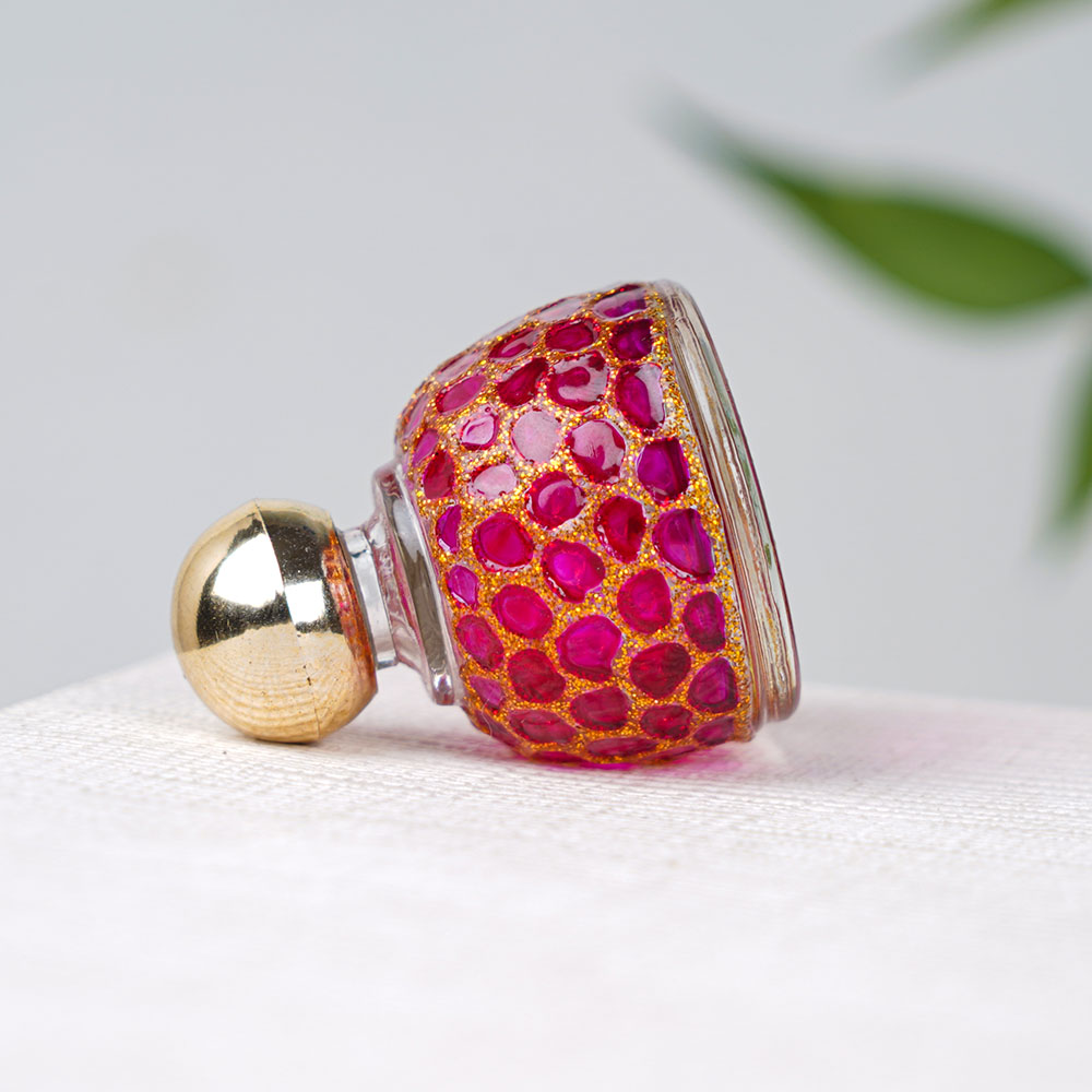 An exquisite glass bottle that is a stunning addition to any collection of decorative perfume bottles. Handmade by skilled Indian craftsmen, this pink bottle features intricate golden sparkles carved into its glass, making it a true work of art. The bottle is sealed with a golden-coloured knob, adding a touch of luxury to its already elegant appearance. This premium perfume bottle is not just a decorative piece, but also practical, as it can be used to store your favourite perfume or oil. The design carved into the glass is a testament to the craftsmen's skill, showcasing a delicate and intricate pattern that adds to the bottle's beauty. This decorative perfume bottle can be placed on a table or shelf to add a touch of sophistication to any room. It makes for a thoughtful and lovely gift for special or festive occasions, such as birthdays or weddings. So, whether you're adding it to your collection of perfume decant bottles or giving it as a gift, this handmade pink and golden sparkle glass bottle is sure to impress.