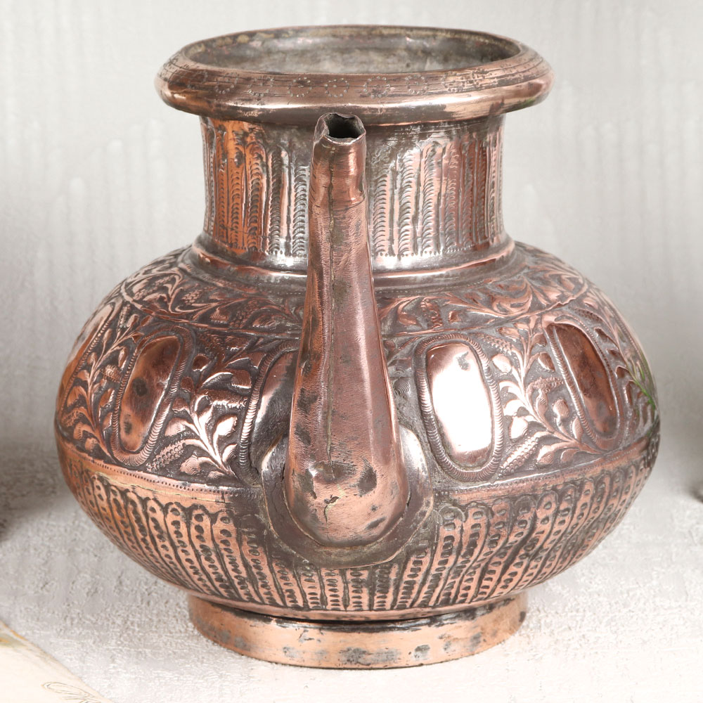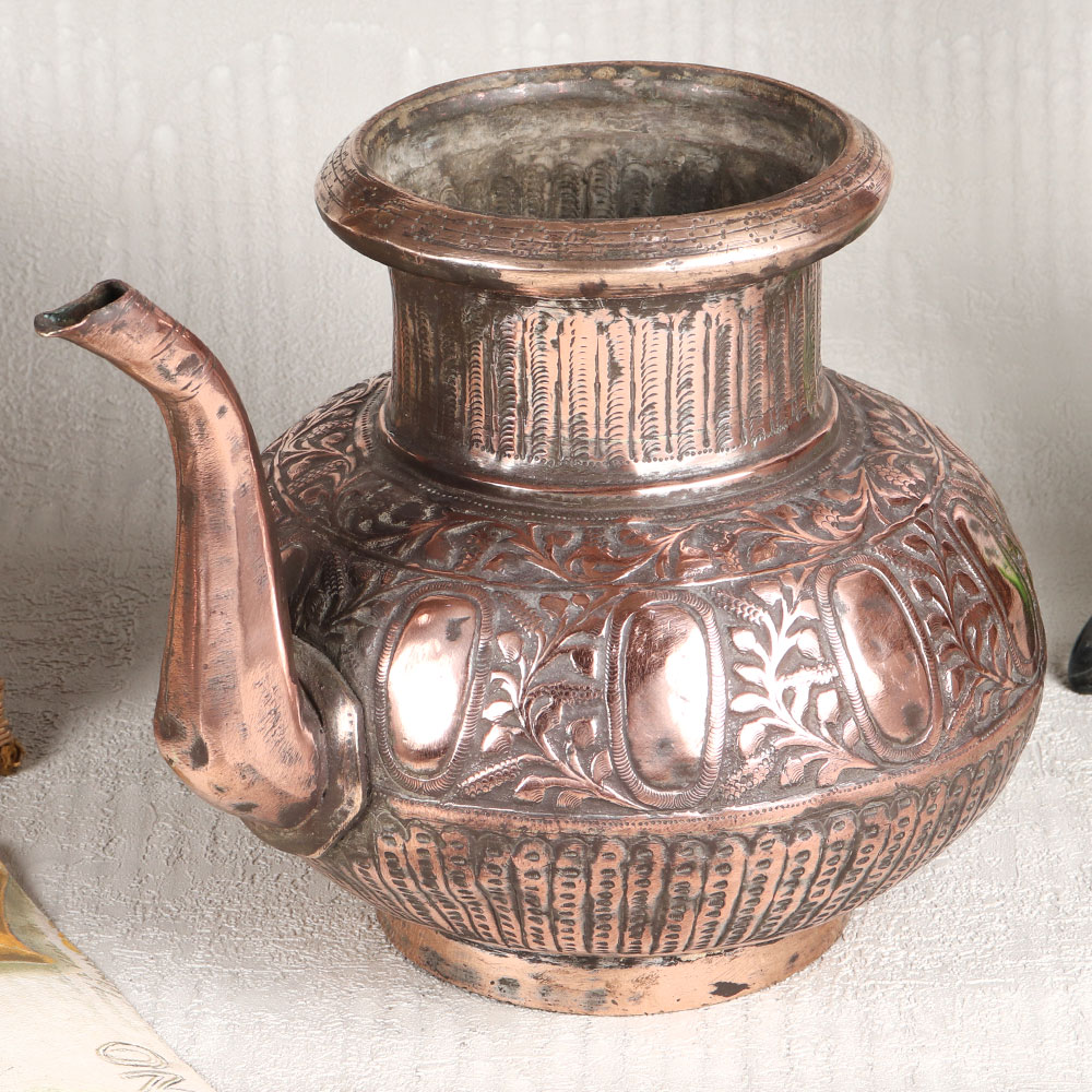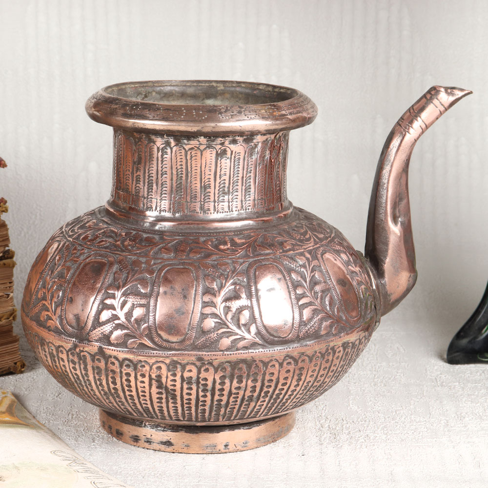This Copper Water Pot with an enchanting spout is adorned with intricate designs in an antique brown finish. This masterpiece is meticulously handcrafted by highly talented Indian artisans from the historic city of Hyderabad, renowned for its rich heritage in Islamic artistry. Crafted from high-quality copper, this pot exudes elegance and sophistication, making it a versatile addition to any setting. Whether adorning your home, office, restaurant, hotel, or cafe, this pot adds a touch of opulence to your decor. Its timeless beauty transcends contemporary and traditional spaces, making it a captivating centerpiece. Beyond its aesthetic appeal, this copper pot serves various purposes. Use it to display fresh flowers, enhancing the ambiance with its rustic charm. Alternatively, employ it during rituals and ceremonies to hold sacred water, embracing tradition and spirituality. It also makes for a thoughtful gift, perfect for special, festive, or auspicious occasions, allowing you to share the allure of this artful creation with your family, friends or relatives. With its blend of artistry, functionality, and cultural significance, the Copper Water Pot is a testament to the craftsmanship and heritage of India, a treasure to be cherished for generations to come.