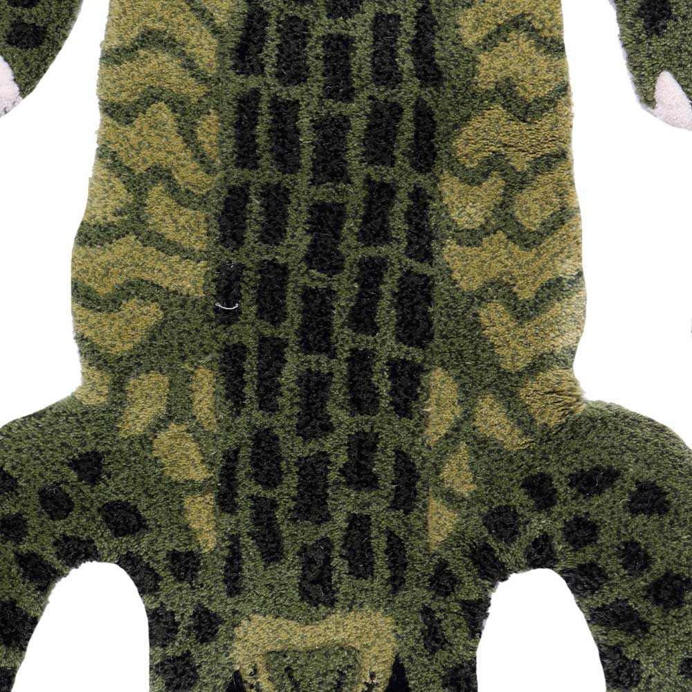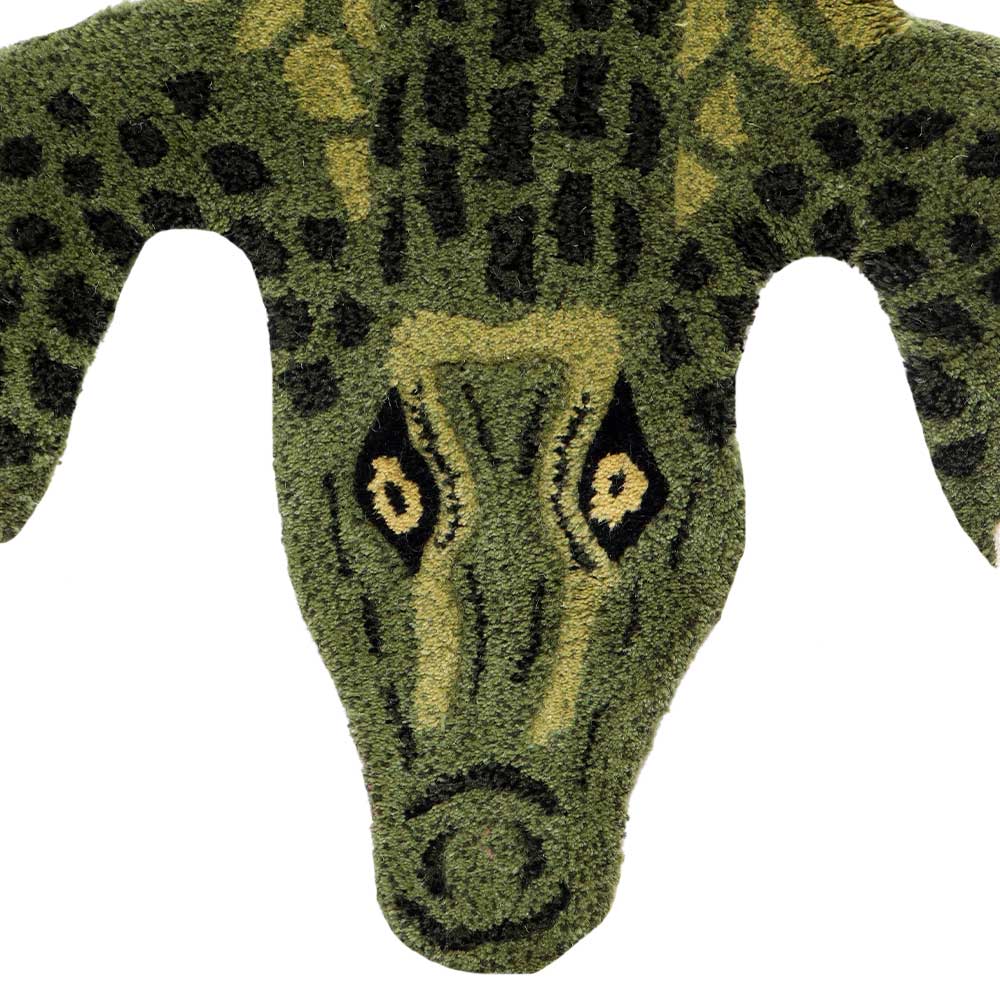 This brilliantly handmade green Alligator rug will brighten up any room. The Alligator Rug is part of a humorous collection of animal kingdom lovable loonies that will make you smile every time. This rug is made of 100% wool and has a cotton backing. By no means perfect, but certainly one-of-a-kind. Cute colorful Alligator rug for children's bedroom has a contemporary design made of pure hand tufted wool. It has a sturdy and welcoming texture. It works well in play areas and as a bedside rug. Also used in hotels, spas and resorts.