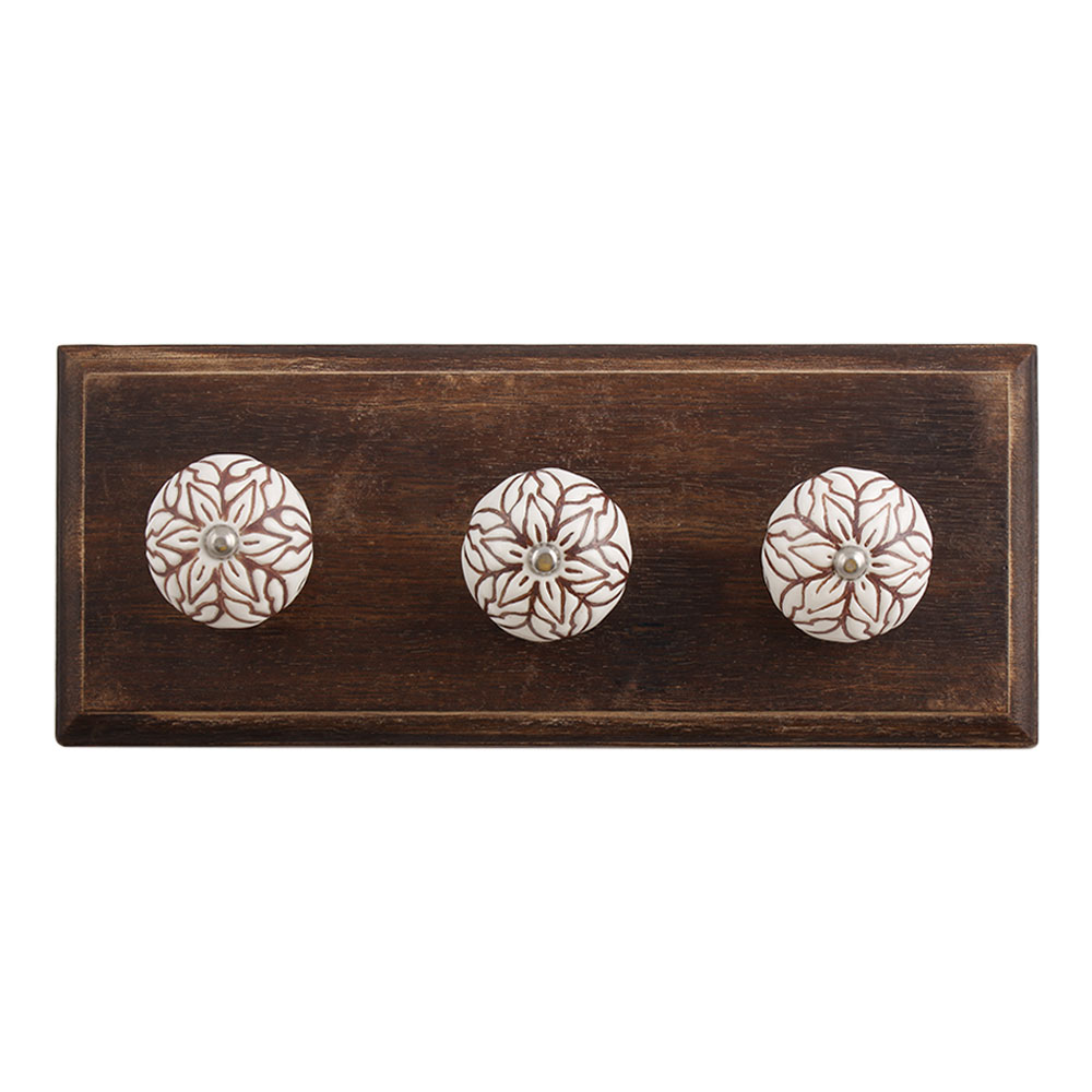 Amaryllis Brown Etched Ceramic Floral Wooden Hook. A Perfect Complement to the Soft Tone of the Wood are these White Traditional Hat & Coat Hook Made of Genuine Porcelain and Brass. It can be use to Hang Jewellery, Leashes, Towels, Scarves, Light Weight Sweaters, Caps Etc.