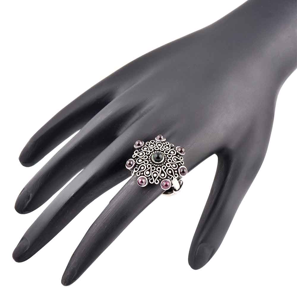 Amethyst and scrolled motifs 92.5 Sterling silver Ring is sure a party stopper and can be worn by your sister, friend, wife and colleague to be worn during weddings, birthdays, cocktail party or other official functions.