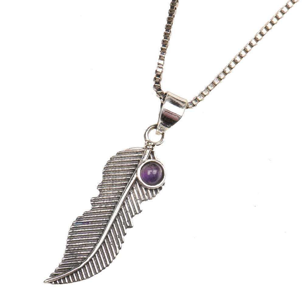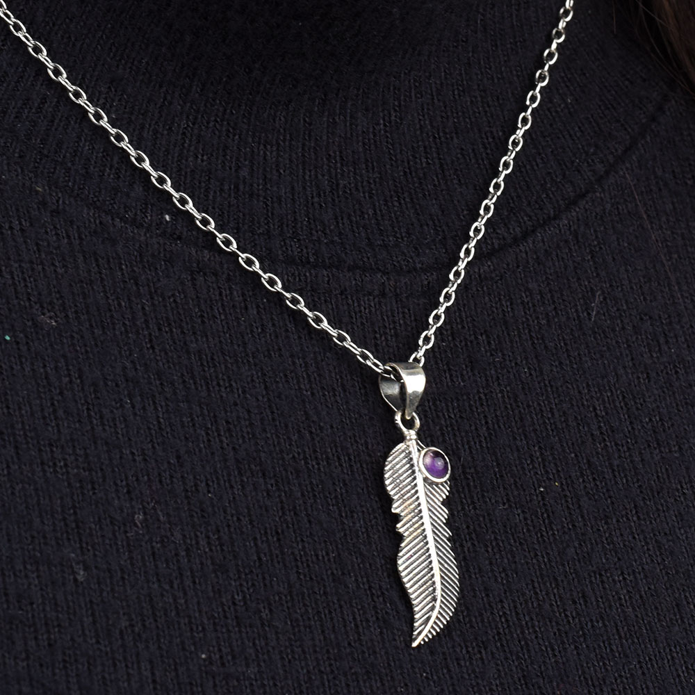 Elegant Amethyst Stone Feather 92.5 Sterling Silver Pendant where the stone is embedded into a feather shape pendant with a ring on top so that it can be worn in a chain. Birthday, Anniversary, Valentine, Christmas and Celebrations for your near and dear ones.