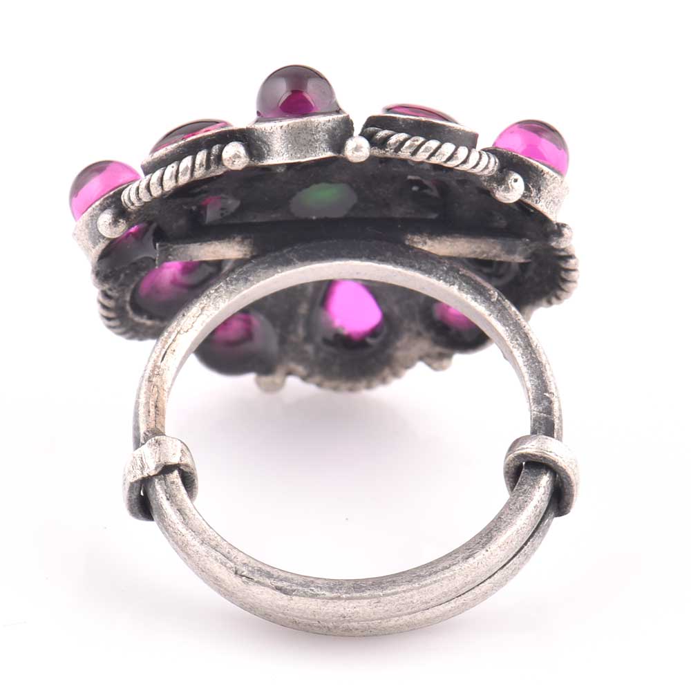 Many amethyst stones in different shapes and sizes studded 92.5 Sterling Silver Ring with a round green onyx stone adds a touch of class and elegance to ordinary dress or outfit such as lehengas, suits, suits , dress or gowns.