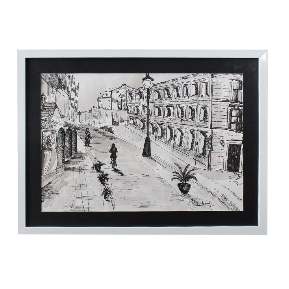 A Pen and InkPencil Drawing painting depicting the life of an urban city. A scene of a day with multi-storey buildings on each side with a vintage street lights and greenery.