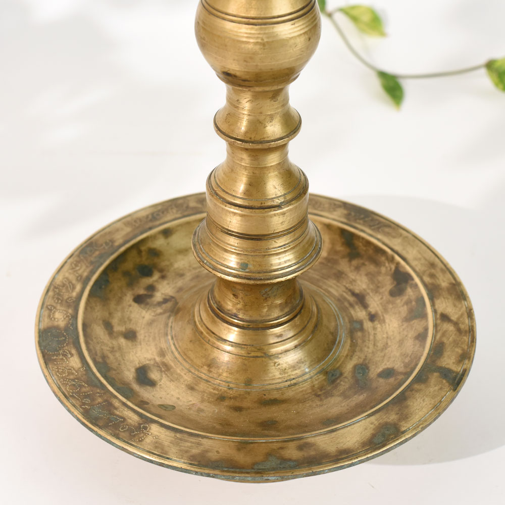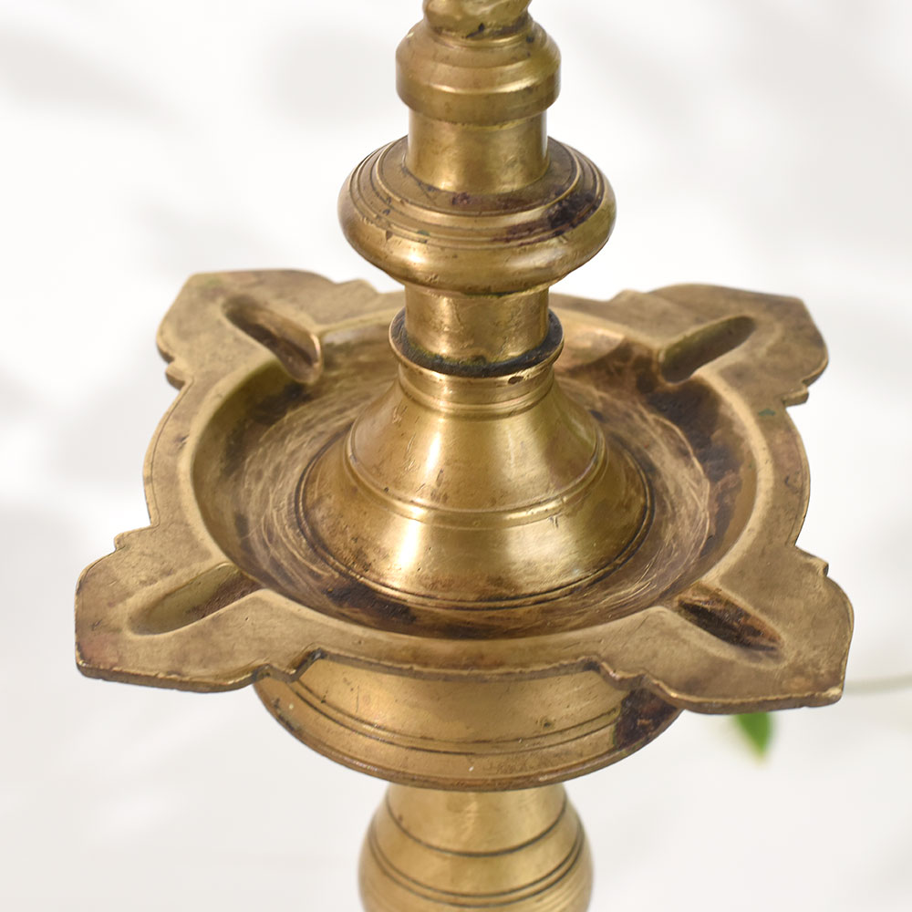 Bring home an authentic piece of heritage with this handcrafted vintage brass oil lamp stand inspired by South Indian temple art. Designed with an ornate finial, a beautifully sculpted multi-tier diya plate, and a tall carved pedestal, this lamp stand reflects the grace and purity of traditional devotional decor. Its heavy brass construction and antique patina highlight the richness of classical metal craftsmanship. Perfect for pooja rooms, meditation corners, ceremonial lighting, and cultural home styling, this lamp stand creates an elegant spiritual ambience. The wide circular base ensures stability, making it a practical and visually striking piece for festivals, rituals, or decorative displays.