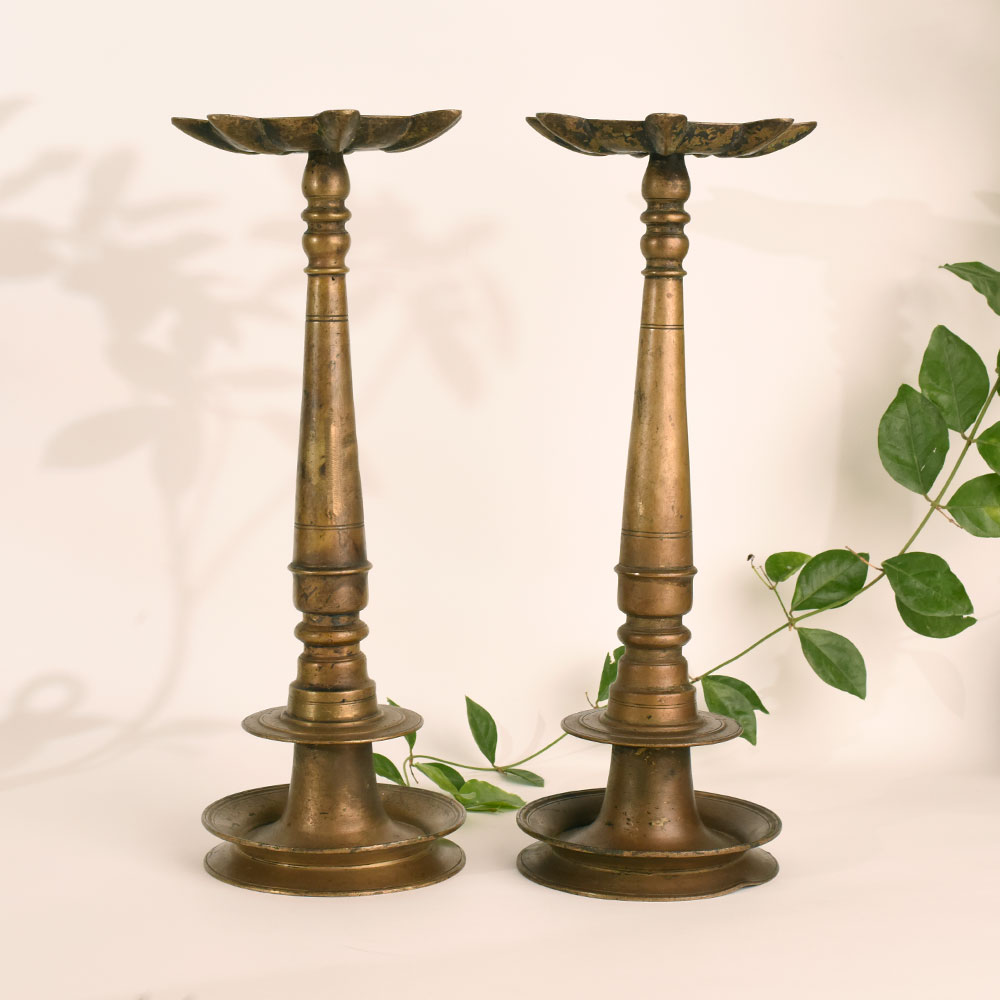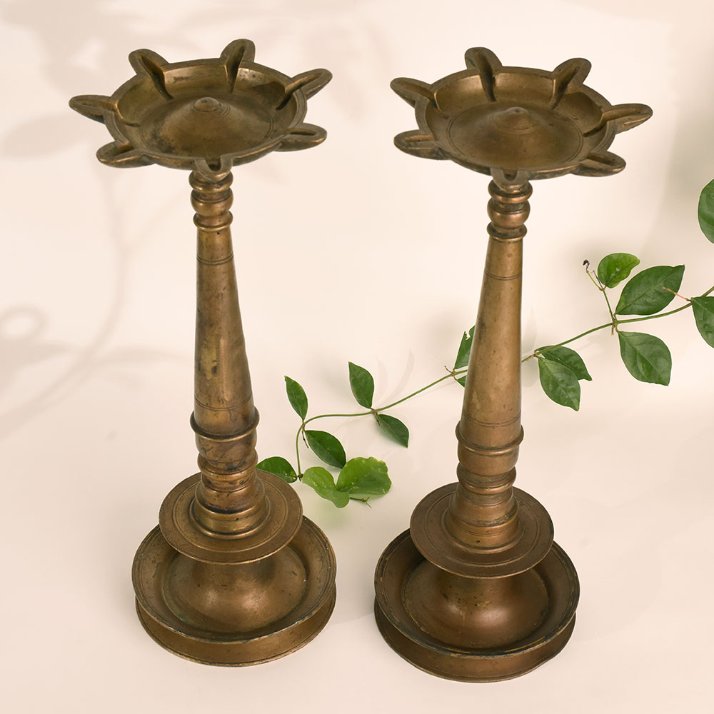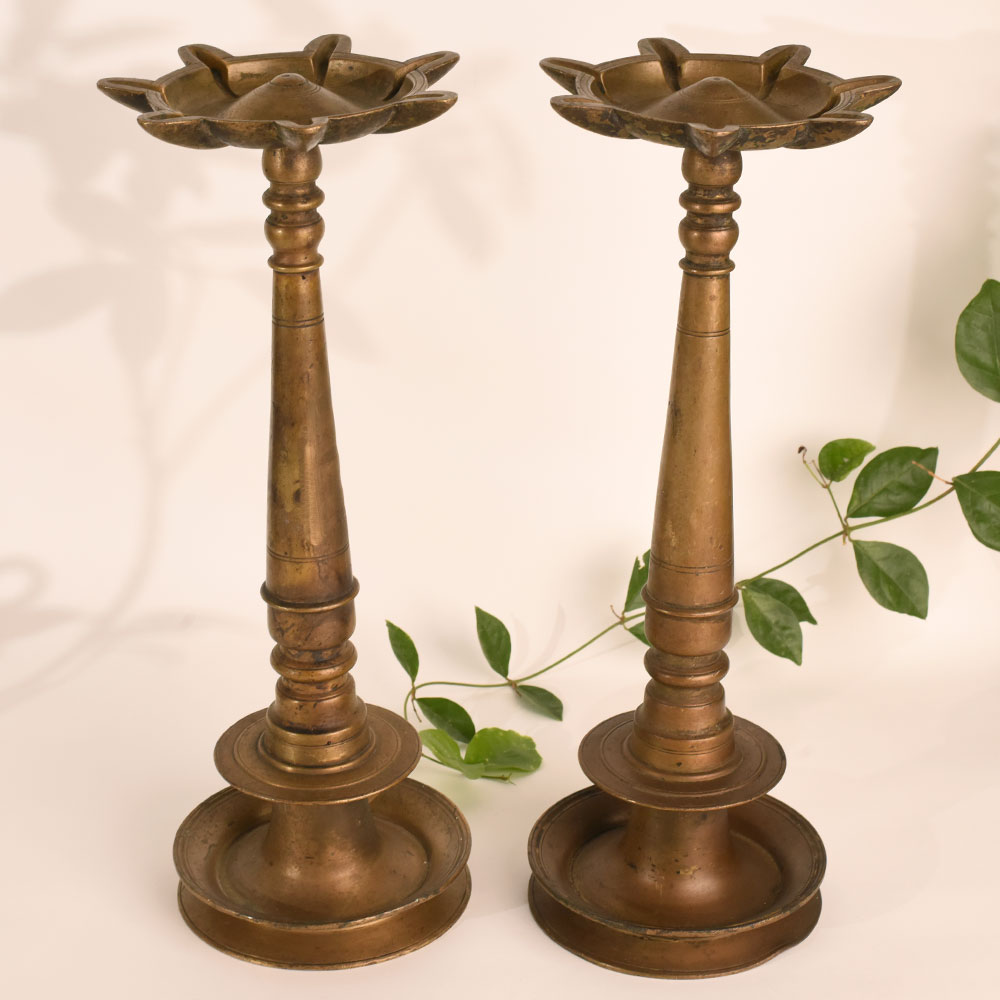Illuminate your home with the timeless elegance of these antique brass oil lamps. Standing tall on sturdy bases, the lamps feature slender stems rising to flower shaped bowls, designed to hold oil and wicks for a warm glow during festivals and ceremonies. Crafted by experienced artisans, the pair embodies traditional Indian design and serves as both a functional lighting source and a decorative accent. Place them on an altar, dining table, or mantel to create a sacred atmosphere during Diwali, weddings, or prayer rituals. The solid brass construction ensures longevity, while the subtle detailing along the stems adds sophistication. These lamps are heirloom pieces that will be treasured for generations.