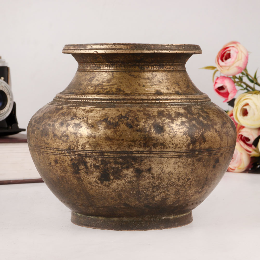 An antique brass holy water pot which is a true testament to artistry and spirituality. With its antique brown finish and meticulous craftsmanship, this Lota stands as a captivating piece of decor. Handmade by highly skilled and experienced Indian artisans using traditional methods, it is made from high-quality brass, ensuring its durability and timeless beauty. This sacred vessel finds its purpose in temples, where it is used to offer water to the revered Shivling, symbolizing the absorption of negativity from the environment and the dissemination of positive energy. Additionally, it serves as a vessel for offering water to the Sun God, aiding in the maintenance of spiritual and mental equilibrium. Ideal for havans, Hindu rituals, and auspicious functions, this Lota serves as a repository for holy water. Its versatility extends beyond religious practices, as it can also be utilized as an indoor flower pot, adorning your home or office with elegance and charm. Moreover, this Brass Holy Water Pot makes for an ideal gift to convey your blessings and good wishes to your loved ones on special, festive, or auspicious occasions.