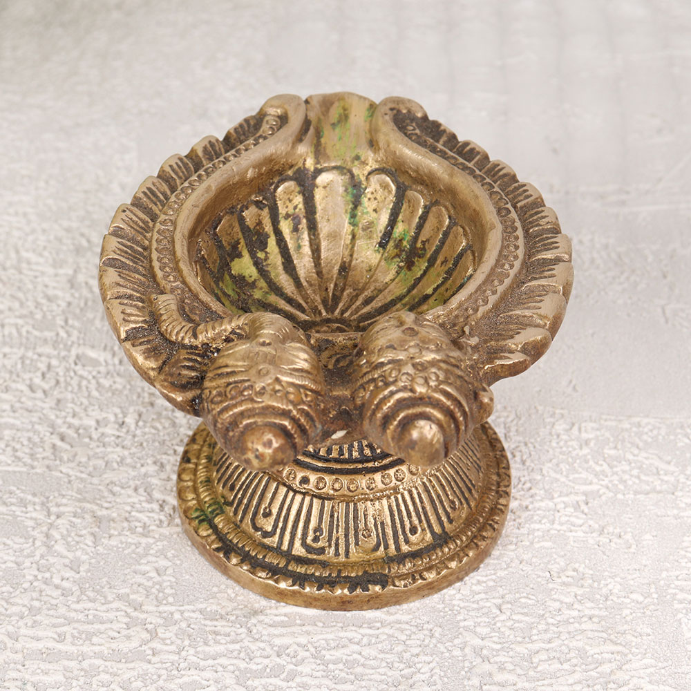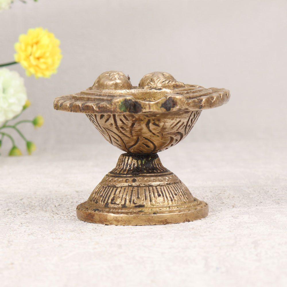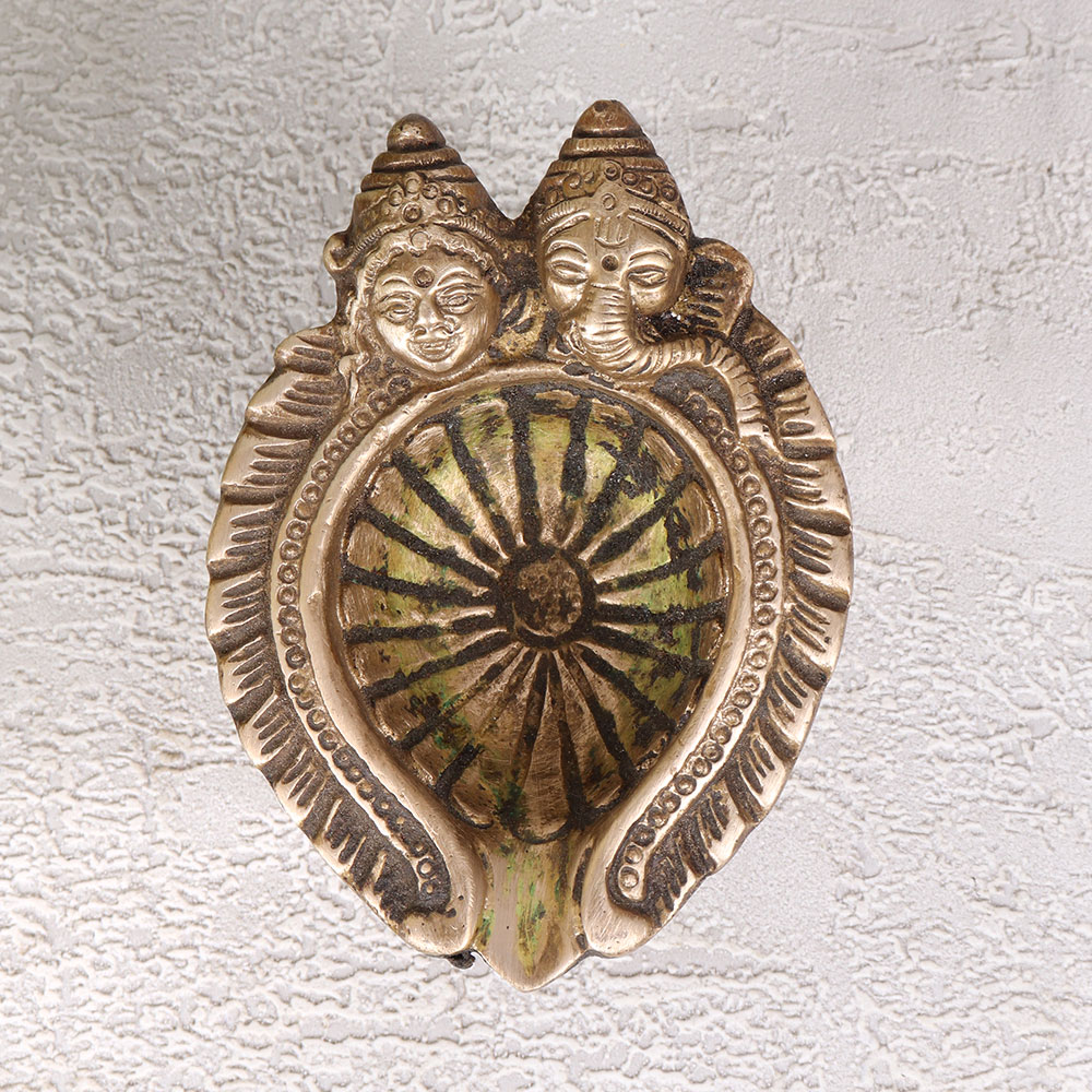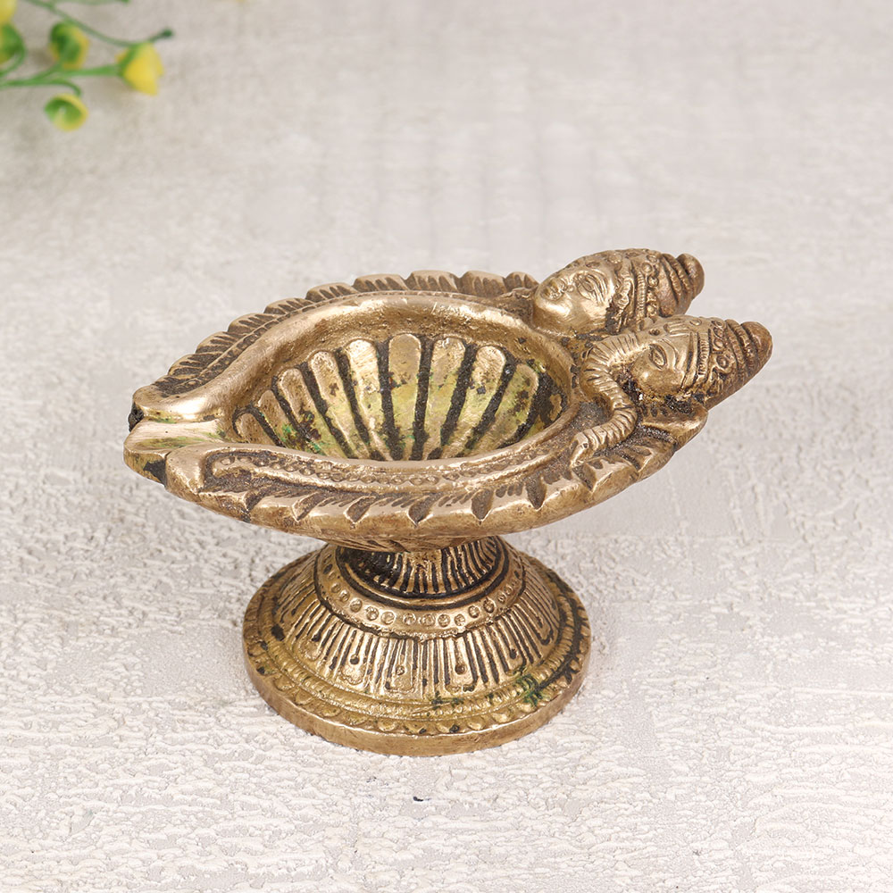 Illuminate your sacred space with the divine radiance of our exquisite Brass Oil Lamp which is a harmonious blend of artistry and spirituality. Handcrafted by talented Indian artisans from premium brass, this lamp features intricate carvings of the revered faces of Goddess Lakshmi and Lord Ganesha, symbolizing prosperity, wisdom, and auspicious beginnings. The antique brown finish adds a timeless charm, making it a perfect addition to your home, office, restaurant, hotel, or cafe prayer room. Designed for use with mustard oil or ghee and a cotton wick, this lamp embodies traditional practices, infusing your space with a warm and serene glow during prayer rituals or meditation. Beyond its spiritual significance, this lamp doubles as an exquisite decor piece, enhancing the aesthetics of any space. It holds the essence of Indian craftsmanship, making it an ideal addition to your vintage collection. Furthermore, it serves as a thoughtful and meaningful gift for your family, friends or relatives on special, festive, or auspicious occasions, spreading blessings and positive energy. Embrace the divine aura and timeless beauty of this Brass Oil Lamp, a testament to the rich cultural heritage and artistic brilliance of India.