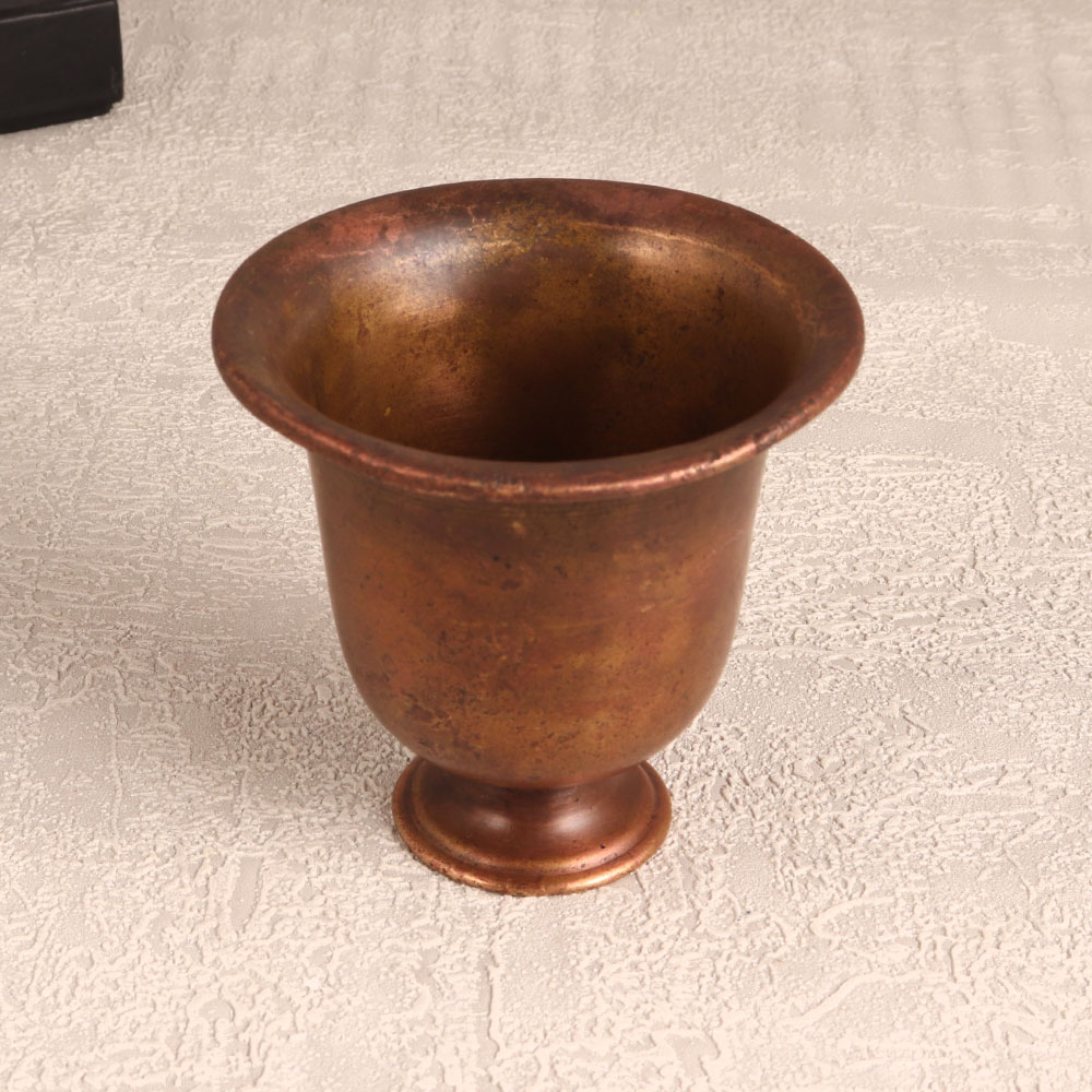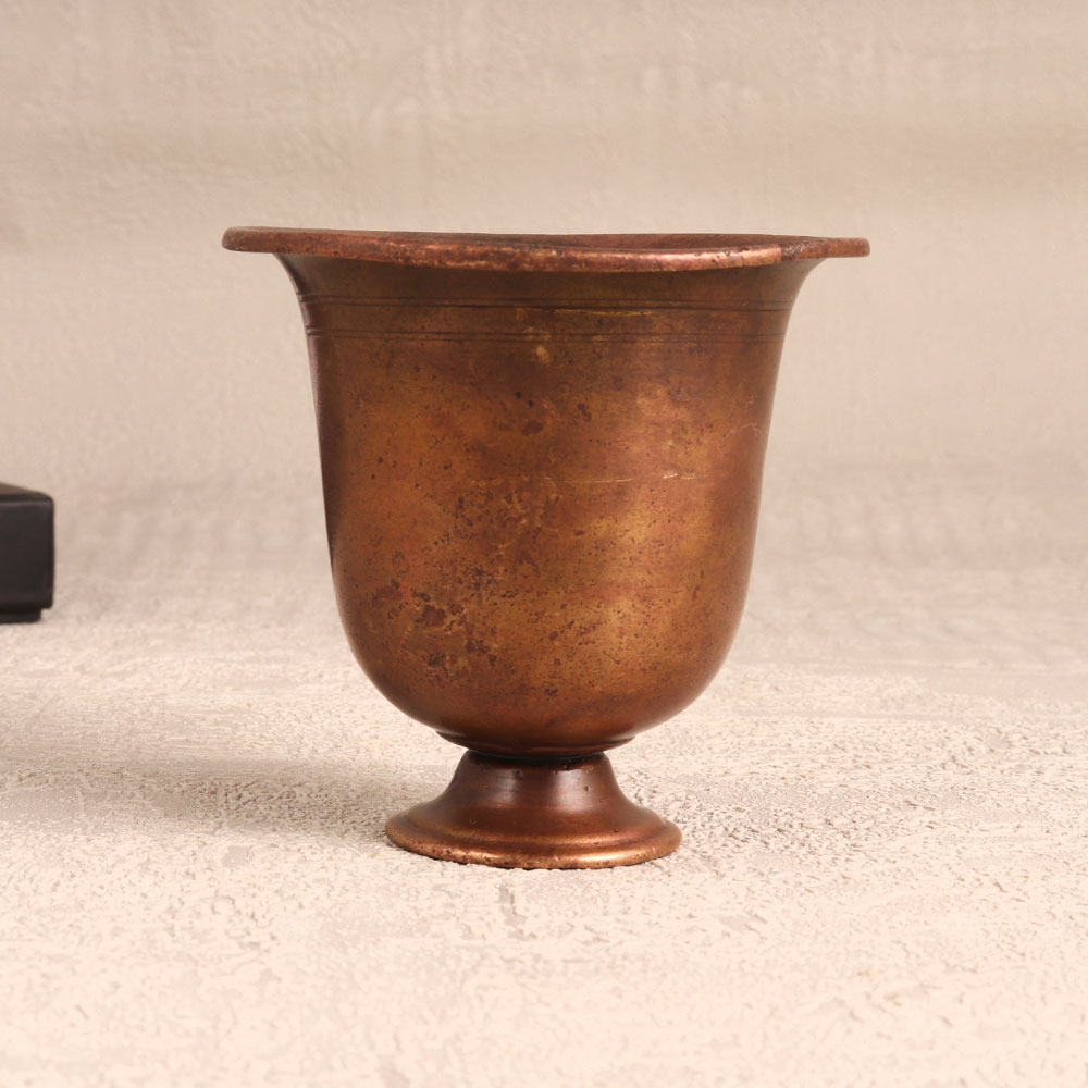 Enhance your spiritual space with the timeless elegance of this exquisite vintage brass holy kumkum cup that is handcrafted by skilled Indian artisans in the revered South Indian art tradition. With its antique brown finish, this ornate piece exudes a sense of tradition and history, making it a valuable addition to your collection of sacred artefacts. Made from high-quality brass, this kumkum cup serves a dual purpose, providing a sacred vessel to hold kumkum tilak or bindi during prayer rituals while also being a stunning decorative item. Its intricate craftsmanship and antique finish make it a conversation piece in any setting. Whether you wish to place it in your home, office, restaurant, hotel, or cafe's prayer room, this kumkum cup adds a touch of Indian heritage and spirituality to your surroundings. Furthermore, it makes for an ideal gift on special, festive, or auspicious occasions, symbolizing the rich cultural heritage and traditions of India, while also bestowing blessings and good wishes upon your family, friends or relatives. Embrace the beauty and sacredness of this vintage brass kumkum cup in your life.
