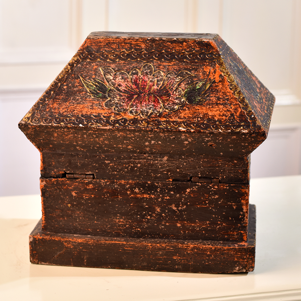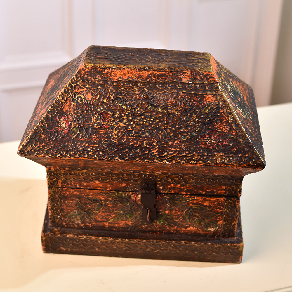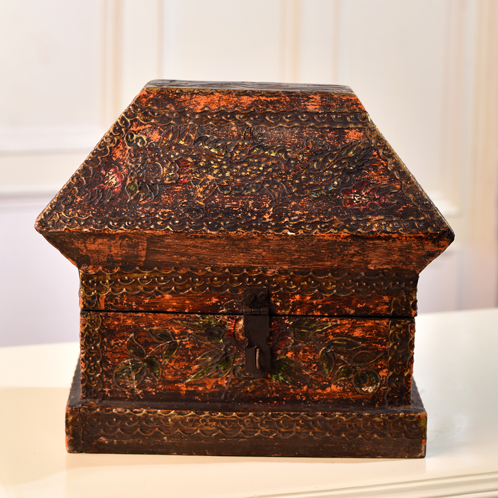 Buy a Wooden Hut-Shaped Jewelry Box online from our website and get a hassle free delivery right at your doorstep. This charming box is crafted with precision by highly skilled Indian artisans, featuring a warm brown finish that adds a touch of rustic charm to any space. The hut-shaped design not only serves as a unique storage solution but also doubles as a delightful decorative piece, ideal for enhancing the ambiance of your home, office, cafe, restaurant, or hotel. What sets this wooden box apart are the intricate engravings of delicate flowers that adorn its surface, creating a visual masterpiece that captivates the eye. The floral motifs add a touch of nature-inspired beauty, making it a perfect addition to any setting. The sturdy latch ensures the safety of your precious jewelry or small items while adding a vintage touch to the overall design. Versatile and stylish, this wooden box is not confined to private spaces. It makes a striking display at exhibitions, showcasing its craftsmanship and aesthetic appeal. Moreover, it becomes a thoughtful and meaningful gift for your family, friends or relatives on special, festive, or auspicious occasions, creating lasting memories and adding a touch of sophistication to their lives. Embrace the charm of this Wooden Hut-Shaped Jewelry Box, where functionality meets timeless beauty.