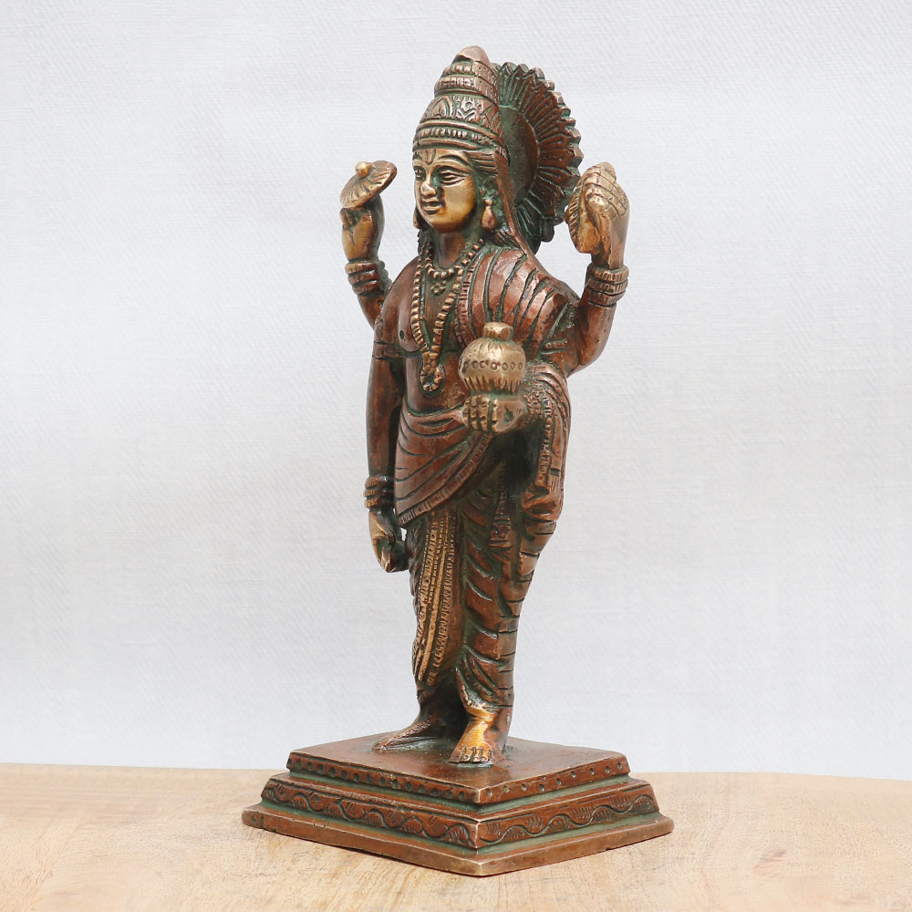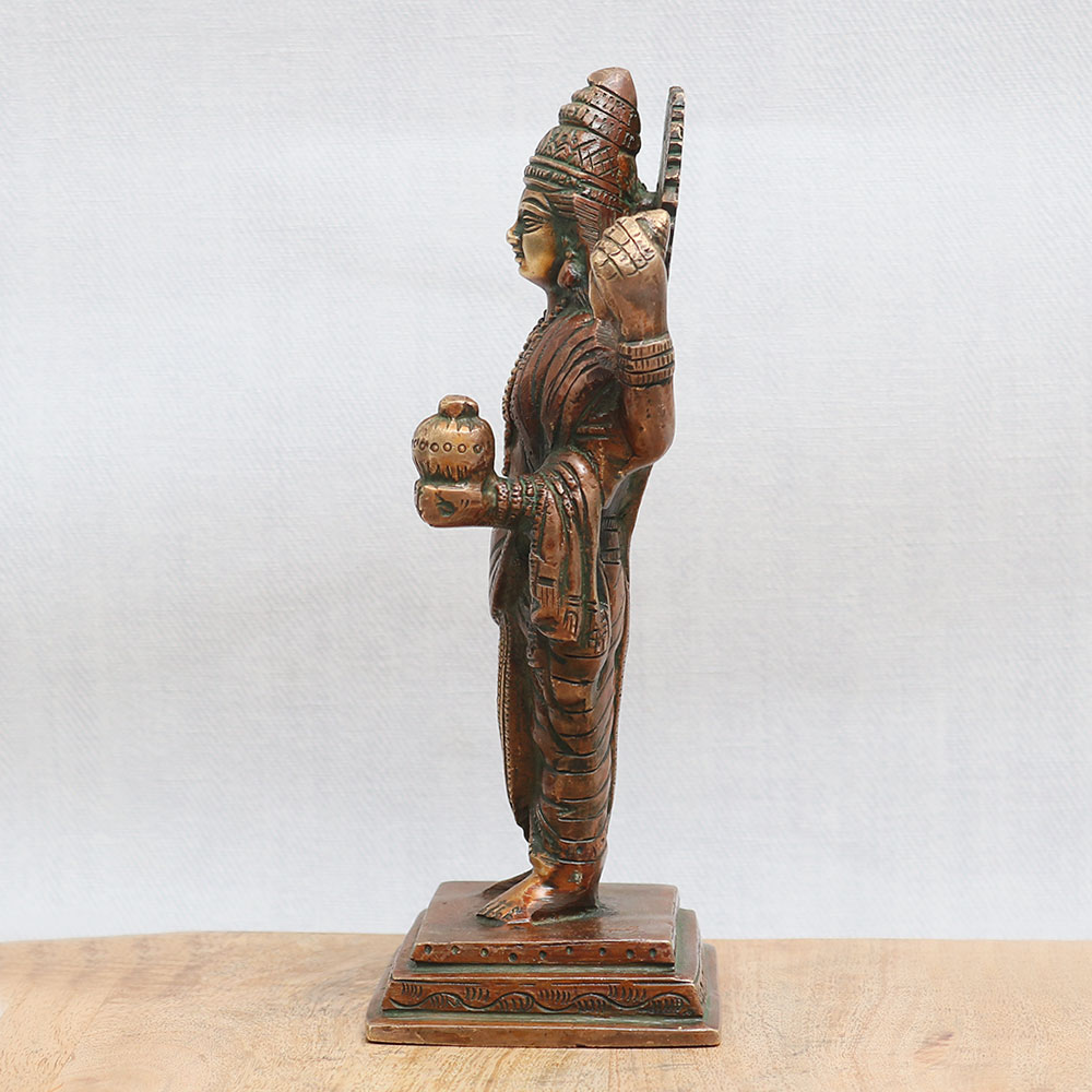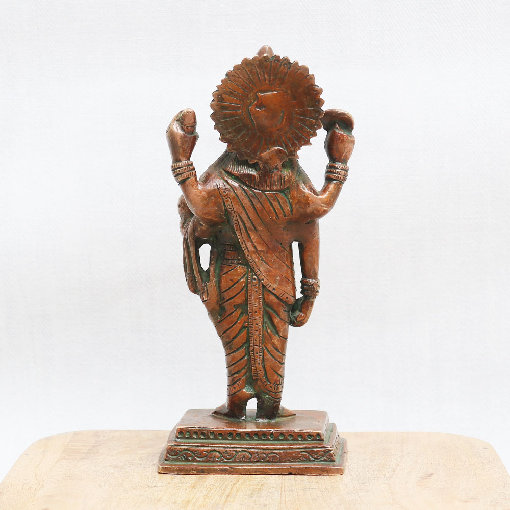 Buy a bronze statue of Lord Dhanvantari who is the revered physician of the devas in Hinduism and an esteemed avatar of Lord Vishnu. This god sculpture boasts a stunning antique brown finish, showcasing the intricate craftsmanship and attention to detail. Handmade by skilled Indian artisans using high-quality bronze, this statue adds an aesthetic touch to any interior decoration, radiating divine grace. Worshipped in numerous temples, this idol of god holds great significance in Hindu rituals and can be placed in your personal temple for worship. Additionally, it serves as a magnificent decorative piece for your home, office, cafe, restaurant, gym, or hotel temple. The presence of this captivating statue creates an aura of spirituality and tranquillity. Furthermore, this bronze idol makes for an auspicious gift on special, festive, or auspicious occasions. Show your loved ones your heartfelt devotion by presenting them with this divine treasure. With the convenience of purchasing idols online, you can now embrace the divine energy of Lord Dhanvantari and elevate the ambiance of your sacred space.