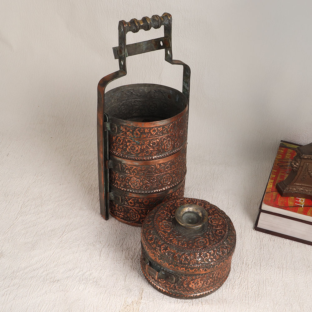 Buy a vintage Tiffin box online that is a true masterpiece of Islamic Art and get a hassle free delivery at your doorstep. Crafted by highly talented Indian artisans, this four-compartment treasure is a testament to their mastery in the art of metalwork. Made from high-quality copper, it boasts an antique brown finish that lends it an air of authenticity, making it the ideal piece for those who appreciate the allure of the past. The Tiffin box features stunning and intricate carvings, showcasing the artisan's dedication to detail and the essence of Islamic art. While its historical and cultural significance is evident, we recommend using it for decorative purposes to preserve its vintage charm. This versatile piece can adorn your home, office, restaurant, hotel, cafe, or shop, adding a touch of cultural richness to any space. It's also a perfect addition to any vintage collection, serving as a timeless reminder of the past. Moreover, this Tiffin box makes for a thoughtful and unique gift for your family, friends or relatives on special, festive, or auspicious occasions, giving them a piece of history infused with artistry. Embrace the beauty of the past with this antique masterpiece.