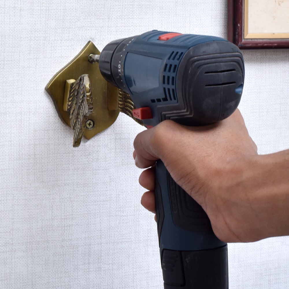 To install, mark the position on your wall, drill a pilot hole, insert a wall plug, and secure the hook with a screw. The mounting system is subtly integrated for a clean look. Tools needed: drill, screwdriver, wall plug.