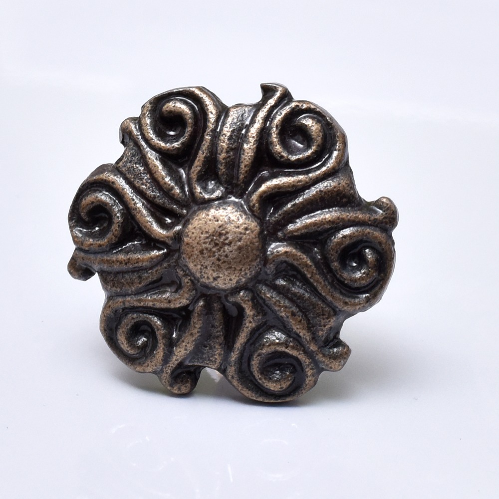 The antique finish of these knobs gives them a timeless look, ensuring they will never go out of style. Their intricate floral pattern makes them a standout piece, bringing character and elegance to any room.