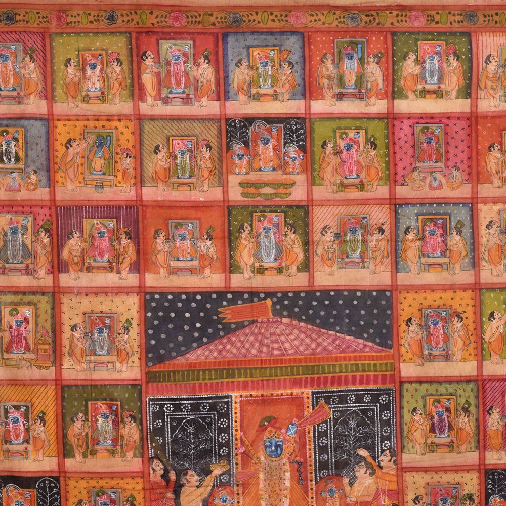 A beautiful Pichwai painting on fabric cloth that is an intricate artwork which showcases Lord Shrinathji. This particular painting depicts Lord Shrinathji in the center, being prayed to by devotees at a temple. Around him are 78 different scenes of Lord Shrinathji at the temple, each being worshipped by two devotees. The painting is a vibrant display of colours, with professional Indian artists having used a variety of hues to create a stunning visual spectacle. The level of detail and intricacy is truly remarkable, with each scene featuring its own unique elements that add to the overall beauty of the painting. This Pichwai painting is perfect for those who wish to adorn their prayer room or temple with a sacred and divine artwork. It is also an auspicious gift for family, friends, or relatives on special or festive occasions such as weddings, birthdays, or religious festivals. Its rich cultural and spiritual significance is sure to make it a cherished and timeless gift for anyone who receives it.