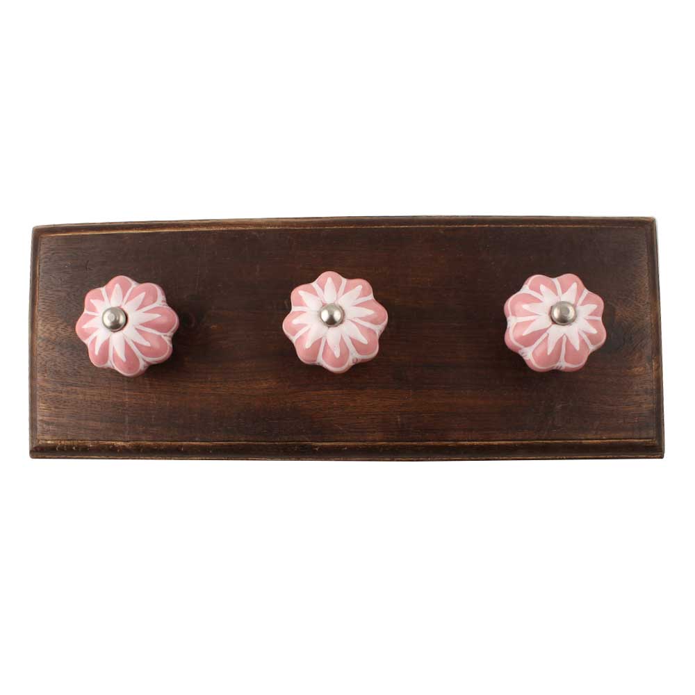 Baby Pink Flower Medium Ceramic Melon Wooden Hook. A Perfect Complement to the Soft Tone of the Wood are these White Traditional Hat and Coat Hook Made of Genuine Porcelain and Brass. It can be used to Hang Jewelry, Leashes, Towels, Scarves, Light Weight Sweaters, Caps etc.