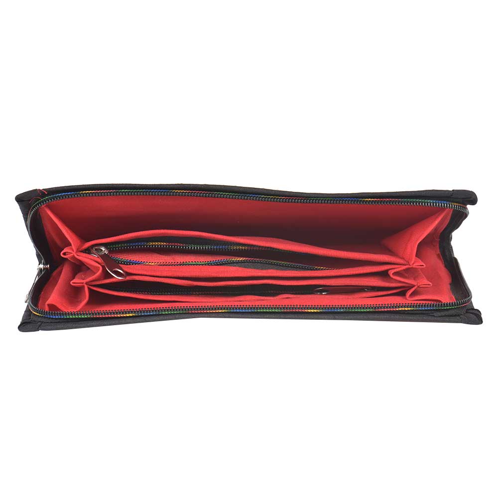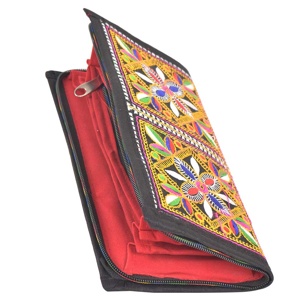 This is a beautiful clutch with mint condition, embroidered fabric on front and imitation raw silk on back, trims and inside. 3 silk section dividers inside the clutch purse. One zippered pocket inside. Two open pockets inside. This beautiful yet functional clutch purse would be ideal for formal or informal occasions.