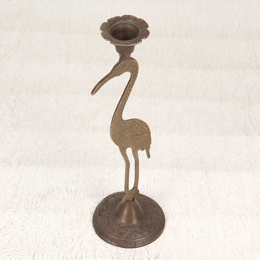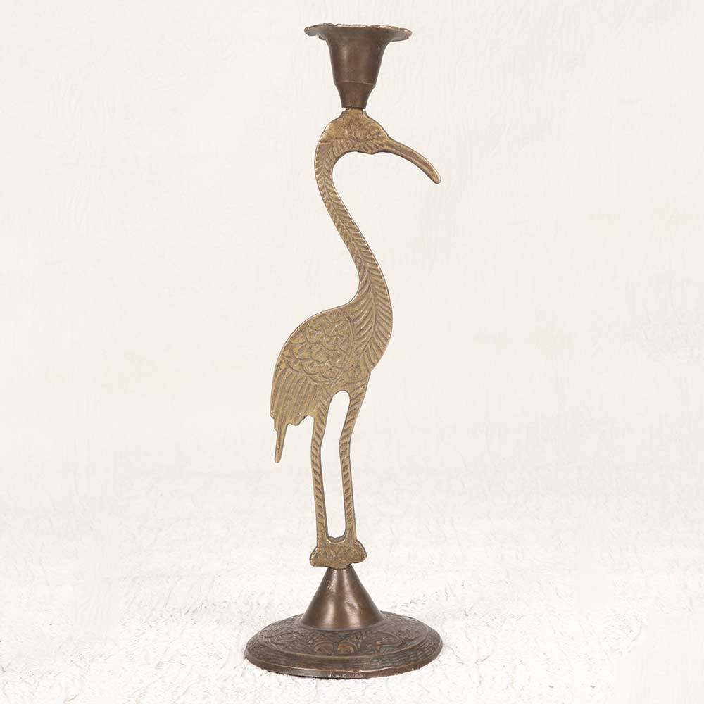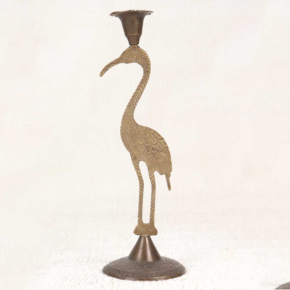Add a touch of vintage whimsy to your home decor with this charming brass bird candle holder. Handcrafted from solid brass, this elegant candleholder features a sculpted bird figure perched atop slender legs, perfect for displaying taper or pillar candles. With its graceful form and artisanal vintage patina, this candleholder lends elegance and visual interest to any space. Place it on your mantel, console table or shelf to illuminate your decor with old-world charm. The sculpted bird design provides an artistic, nature-inspired element that sparks curiosity and conversation. Give it as a gift to avid decorators and those who appreciate fine craftsmanship. For an illuminating accent that evokes vintage sophistication, this brass bird candle holder makes a beautiful addition to your home. Sculptural form meets candlelight in this artistic decor piece.