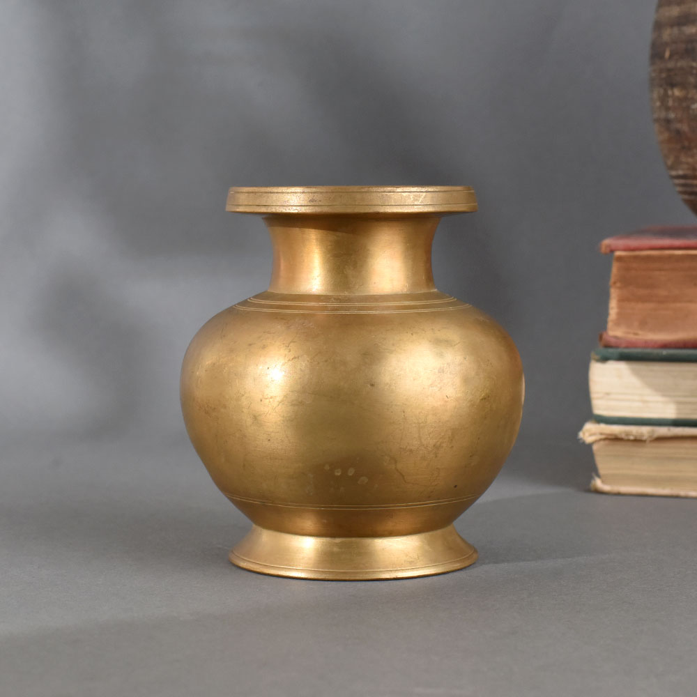 This antique brass holy water pot is a beautifully handcrafted piece inspired by traditional Indian design. Known as a “Lota,†it has been used for centuries in religious ceremonies, daily puja, and temple rituals to hold sacred water. The pot features a rounded belly, narrow neck, and wide flared mouth, giving it a graceful yet functional shape. Crafted from solid brass, this pot not only carries cultural and spiritual significance but also exudes a warm golden sheen that adds elegance to any space. Its smooth surface and vintage finish make it a collectible item for antique lovers and a perfect addition to home décor or sacred altars. Whether used for rituals, as a decorative artifact, or as a heritage collectible, this brass pot reflects timeless tradition and craftsmanship.