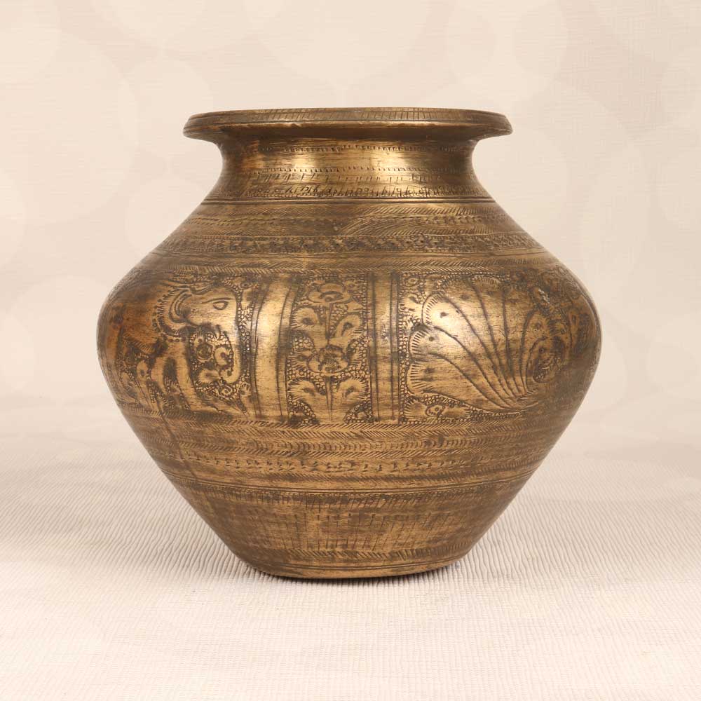 Immerse yourself in divinity with the intricately hand-engraved Surya Brass Holy Water Pot. This vintage-style vessel made from premium brass brings ceremonial charm into your home. Inspired by timeless South Indian artistry, this holy water pot features delicate floral motifs along the brass body and handle. The gently curving spout allows water or flower petals to gracefully pour out during rituals and prayer. Place this vessel on your home altar or use it to create a sacred ambiance, transporting you to tranquility. Cherish cultural relics and connect with your faith by bringing home the Surya Brass Holy Water Pot today. Handmade brass construction ensures durability and lasting beauty, making this an heirloom to pass down for generations. Honor tradition while elevating your home decor with this special vessel.