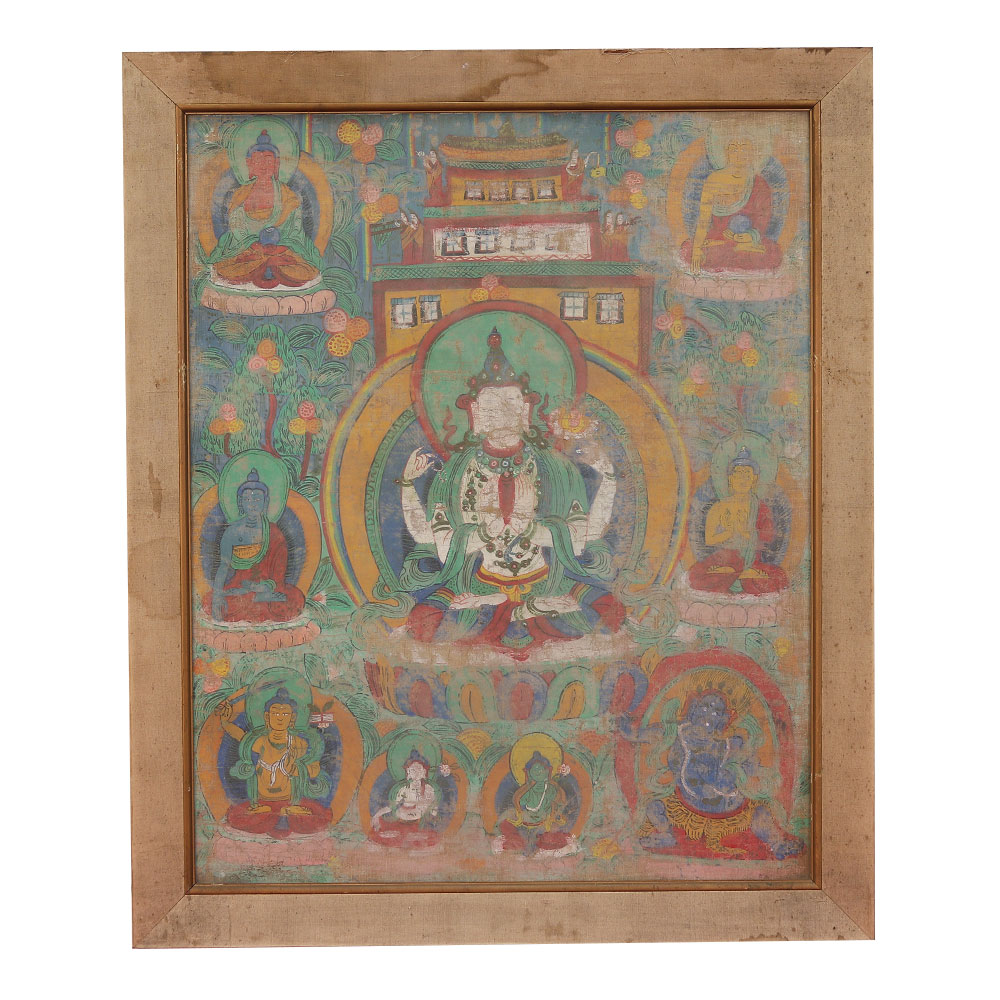 Immerse yourself in the captivating world of Tibetan Buddhist art with this exquisite cloth painting in a vintage wooden frame. Crafted with meticulous attention to detail, this one-of-a-kind piece will elevate the ambiance of any room and transport you to the serene landscapes of the Himalayas. As you gaze upon the vibrant colors and intricate patterns of this Buddhist painting, you'll be drawn into a realm of profound contemplation and spiritual enlightenment. The sacred symbols and imagery have been revered for centuries, imbuing this piece with a timeless, transcendent quality. Whether you're a devoted practitioner of Buddhism or simply appreciate the beauty of Eastern art, this cloth painting is a must-have addition to your home or meditation space. Surround yourself with the peaceful energy of the Himalayas and let this artwork inspire your journey of self-discovery and inner peace.