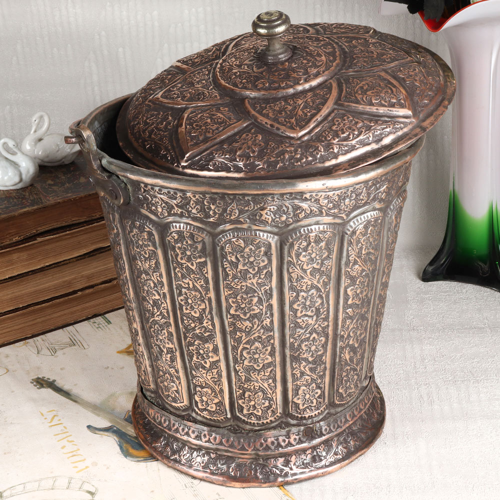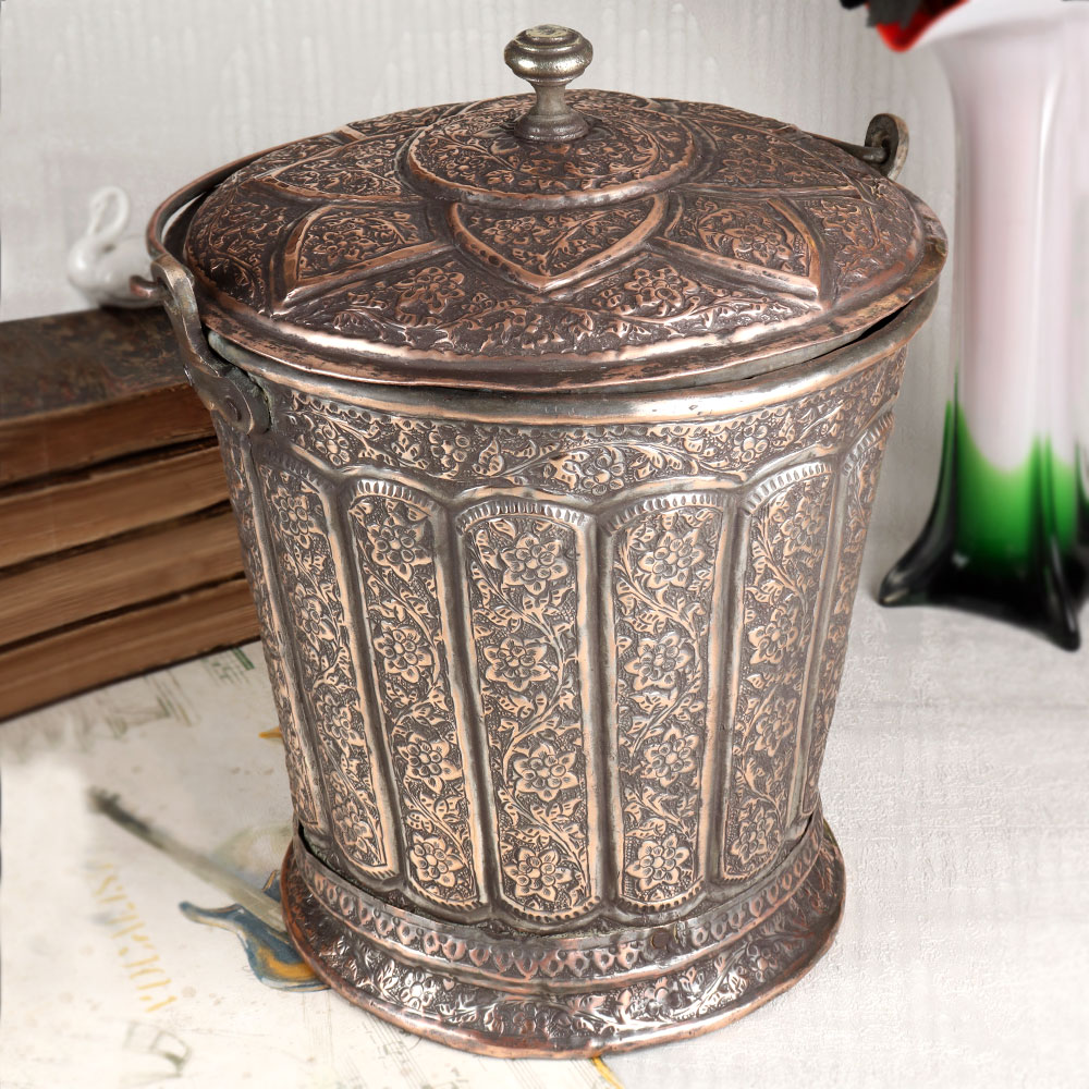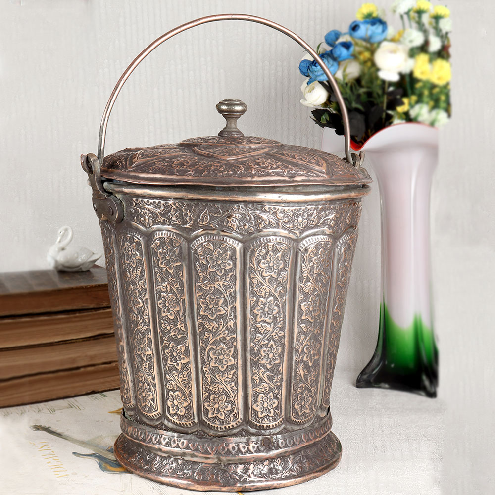 A Copper Bucket with Lid and Handle that is adorned with exquisite floral engravings, and finished in an enchanting antique brown hue. Handcrafted by professional Indian artisans, this piece seamlessly blends Islamic Art with timeless elegance. Crafted from high-quality copper, this bucket is not just a decorative item but a versatile addition to any space. Its charming floral designs, intricately engraved by master artisans, make it a stunning focal point in your home, office, restaurant, hotel, or cafe. This multifunctional masterpiece can be employed as a flower pot, lending a touch of nature's beauty to your surroundings. Its durable construction ensures it can withstand both indoor and outdoor use. Looking for a thoughtful gift? This Copper Bucket is perfect for special, festive, or auspicious occasions. Its rich cultural heritage and impeccable craftsmanship make it a cherished present for your family, friends or relatives, symbolizing the warmth and depth of your affection. Embrace the artistry of India and infuse your space with the allure of this Copper Bucket that is a testament to craftsmanship, culture, and enduring beauty.