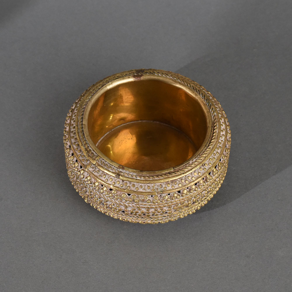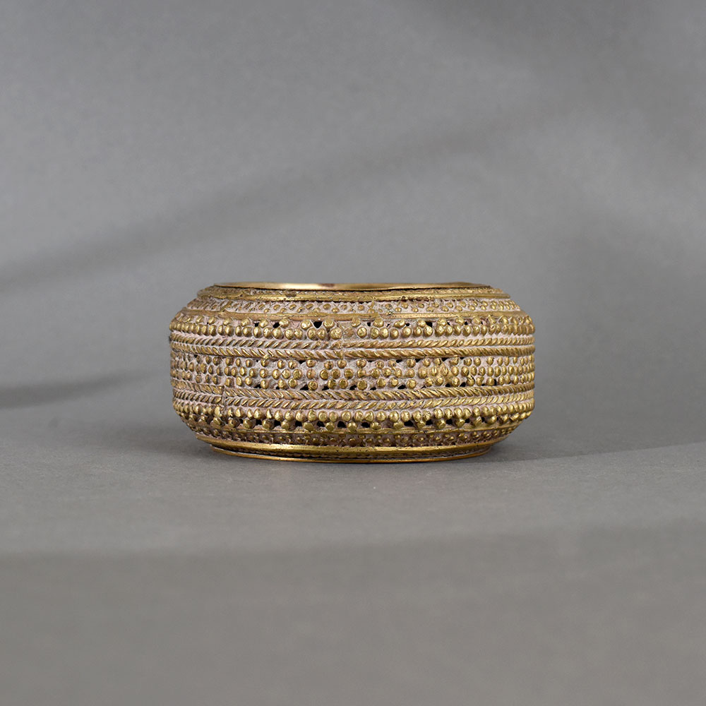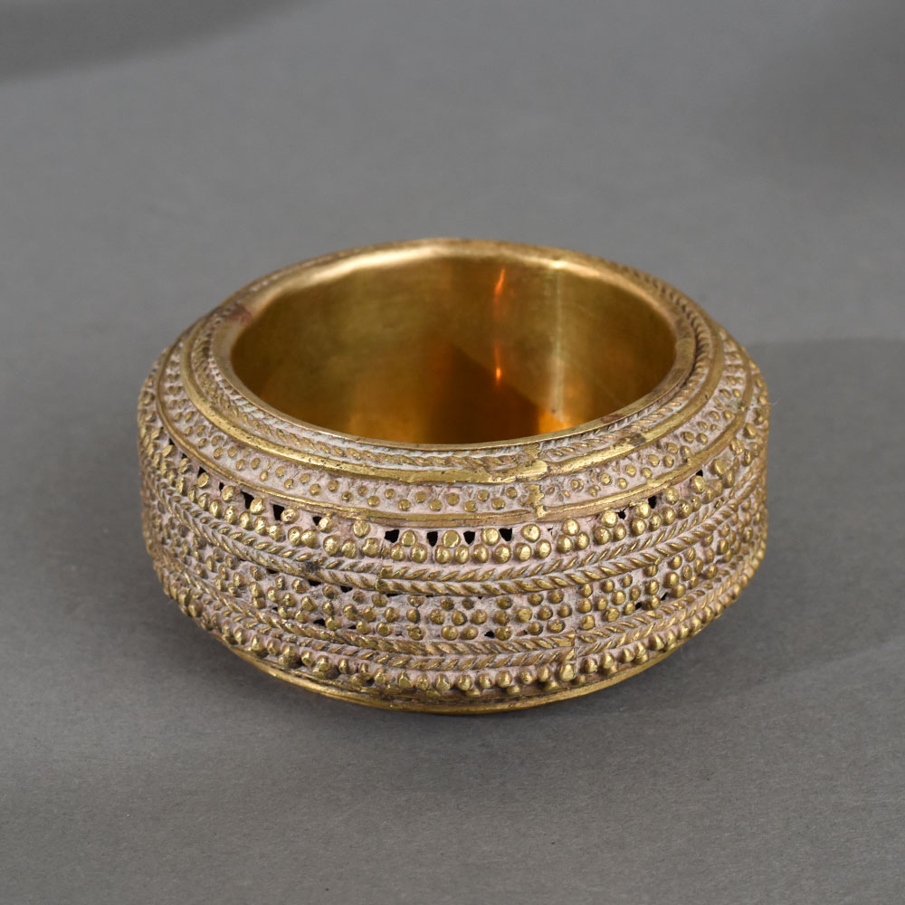 This vintage brass tribal ashtray exudes traditional charm with its bold, circular form and detailed ethnic engraving. Handcrafted by skilled tribal artisans, the ashtray features richly textured designs, including dotted rows, rope-like bands, and meticulously stamped patterns that symbolize fertility, community, and ritual in tribal storytelling. Its thick rim and substantial weight provide both aesthetic gravitas and practical function. More than just a smoking accessory, this ashtray doubles as a conversation piece, ideal for rustic, bohemian, or antique-themed interiors. Its handcrafted imperfections add to its authenticity and vintage value, making it a collectible heirloom with historical depth. Perfect as a functional piece or as a decorative accent on desks, coffee tables, or sideboards, this ashtray represents the artistic legacy of India’s indigenous communities.