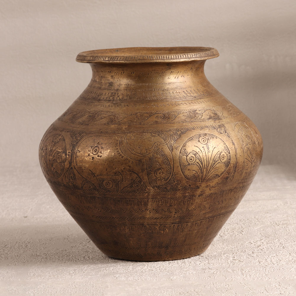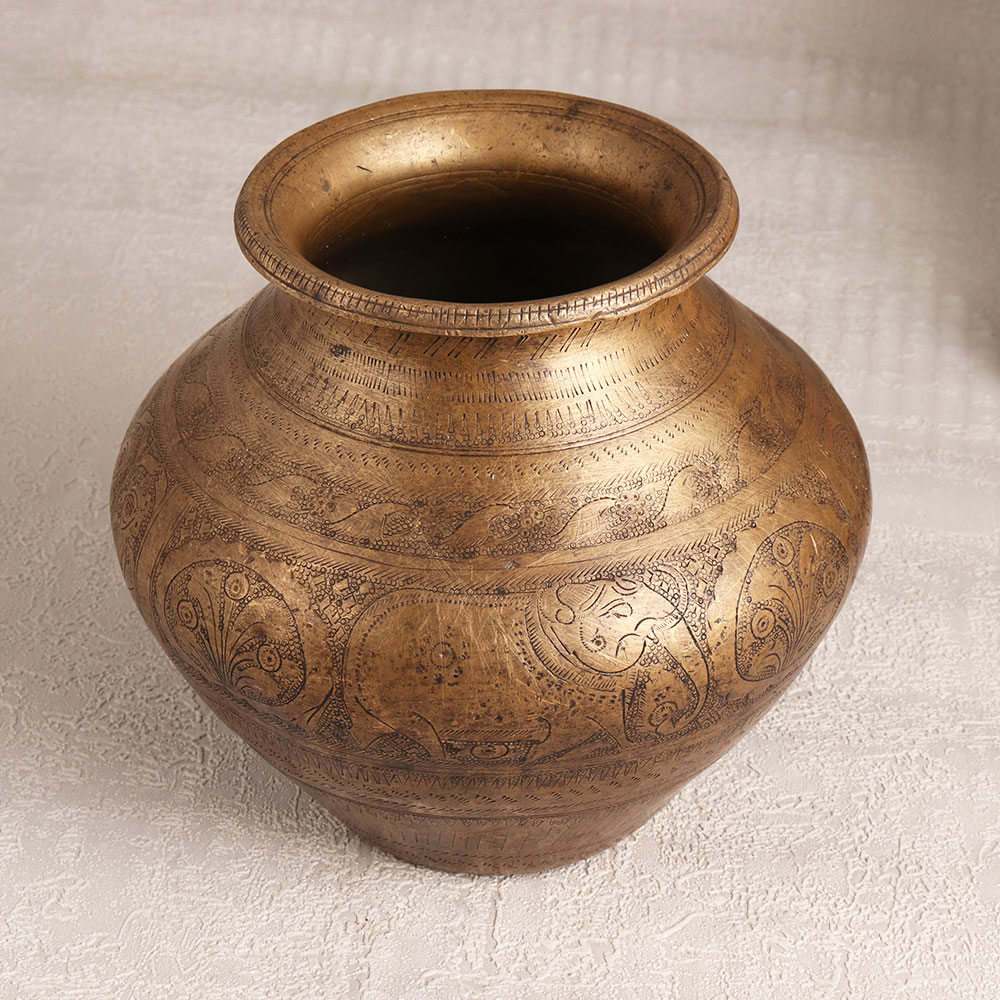 Decorate your interior with our exquisite Vintage Brass Holy Water Pot adorned with intricate elephant engravings. Meticulously crafted by skilled Indian artisans, this unique piece is a testament to their craftsmanship. The antique brown finish lends an air of timeless elegance, making it a versatile addition to any setting, be it at home, office, restaurant, hotel, or cafe. This multi-functional artefact serves as a vessel for holy water during prayer, enhancing the sacred atmosphere, while its ornate design allows it to double as a stunning receptacle for flower decorations. The pot, fashioned from high-quality brass, embodies both durability and beauty, reflecting the rich cultural heritage of India. Ideal for vintage collectors, this piece is a treasure that adds character to any space. Gift a touch of tradition and spirituality to your family, friends or relatives on special, festive, or auspicious occasions. Embrace the artistry of the past with this timeless brass holy water pot, a symbol of devotion and craftsmanship that transcends generations.