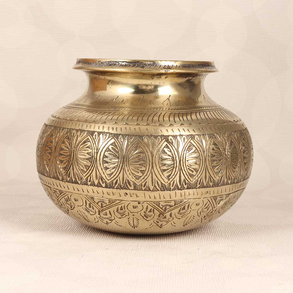 Step into the past with this engraved vintage brass cooking pot exuding exotic South Indian artistry. Though too precious to cook with, this brass beauty lends vintage charm and intricate detail to any space when used decoratively for flowers or greenery. Bring a touch of vintage charm and exotic detail into your home with this brass cooking pot engraved with traditional Indian art. Let its intricate patterns and designs showcase your fresh flowers and foliage, elevating any space with old-world flair. A true conversation piece, this brass pot reflects remarkable artistry that deserves to be displayed, not hidden away in a cupboard. Give your home decor a vintage upgrade with this exotic floral vessel.