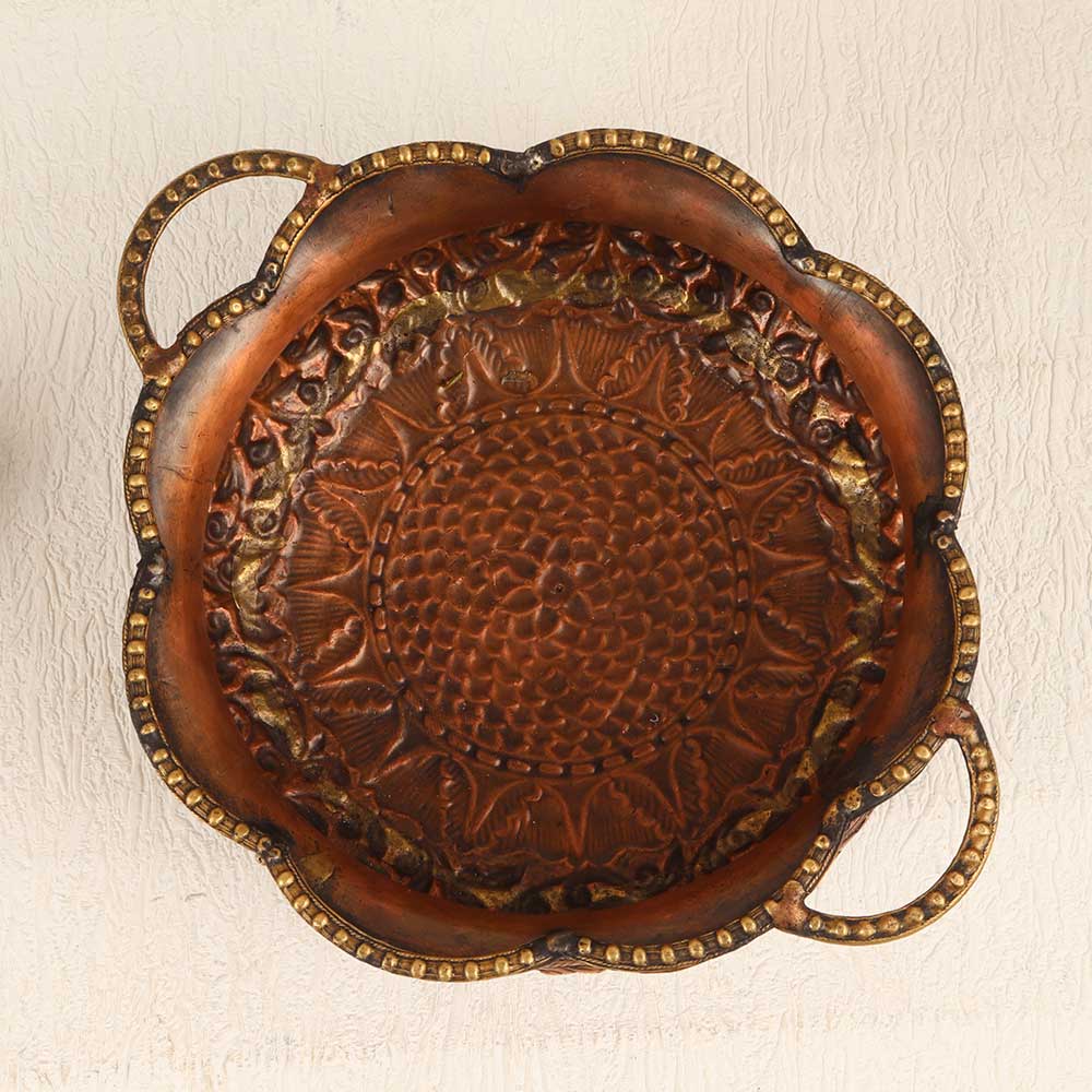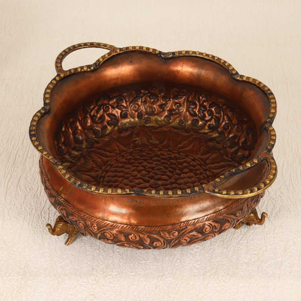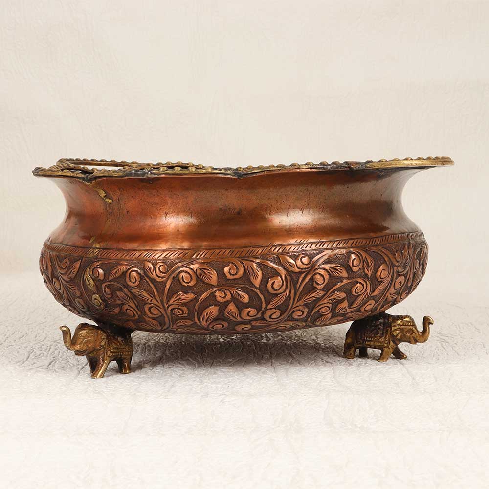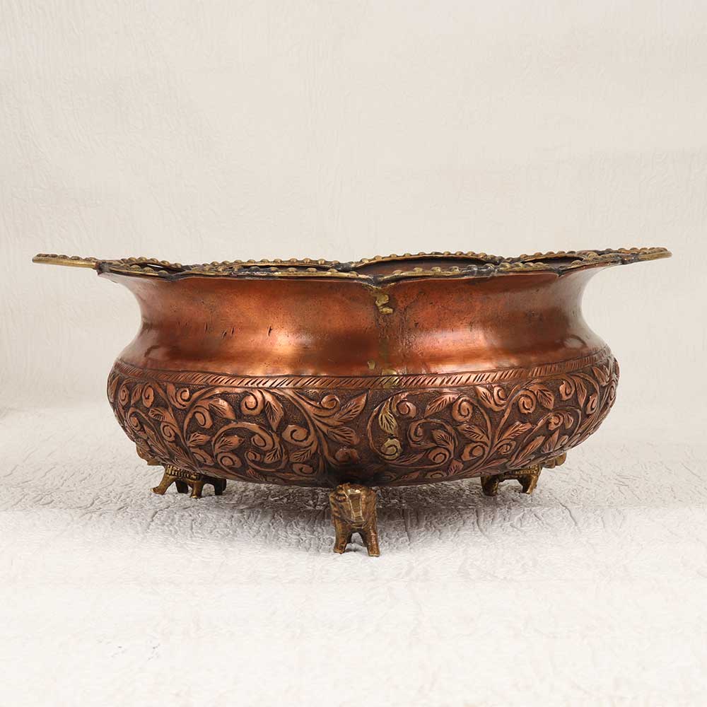 This Vintage Copper Brass Round Urli Pot is a timeless piece of artistry that seamlessly combines craftsmanship and elegance. Handcrafted by highly talented artisans, this urli pot boasts intricate engravings that tell a story of tradition and cultural richness. The round shape, coupled with four stands in the form of majestic elephants, adds a touch of regality to its design. Crafted from high-quality copper brass, the urli pot features a warm antique brown finish, providing it with a distinctive vintage charm. The attention to detail is evident in every curve and pattern, making it a captivating addition to any space. Its versatile nature allows it to grace the interiors of homes, offices, restaurants, hotels, or cafes with equal grace, becoming a focal point of admiration. This urli pot not only serves as a unique decorative piece but also holds sentimental value as it can be added to your vintage collection. Furthermore, it makes for an extraordinary gift, elevating the spirit of special, festive, or auspicious occasions. Embrace the allure of the past with this Vintage Copper Brass Round Urli Pot which is a testament to craftsmanship, heritage, and timeless beauty.