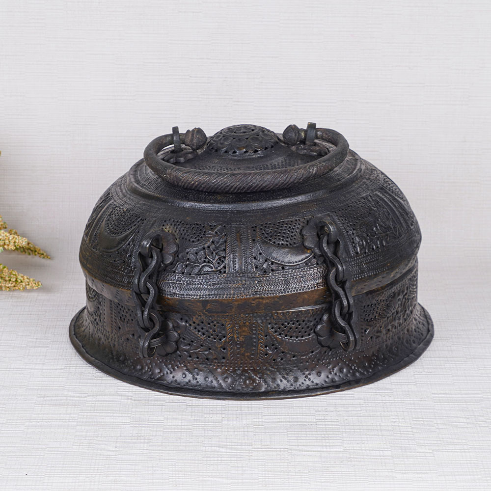 Introducing a Brass Vintage Jewelry Box in a captivating black hue, boasting a mesmerizing round shape that exudes timeless elegance. Crafted to perfection, this magnificent box features a secure latch for safekeeping and a convenient handle atop for effortless portability. Its surface is adorned with breath-taking engravings, showcasing intricate and beautiful designs that reflect the rich cultural heritage of India. This jewelry box carries with it a rich history, having been used traditionally in Indian households to safeguard precious ornaments. Meticulously handmade by skilled Indian artisans, each piece is a testament to their craftsmanship and attention to detail. Versatile in its functionality, this remarkable jewelry box can be utilized to store your precious gems and trinkets or can serve as a stunning display piece in exhibitions, museums, or your shop, hotel, or restaurant. Moreover, it makes for an incredible gift choice for your loved ones on special or festive occasions, imparting a sense of timeless beauty and sophistication. Indulge in the elegance of the "Best Jewelry Box" – a black brass treasure that seamlessly combines aesthetics and functionality, adding a touch of opulence to your life.