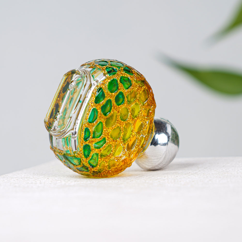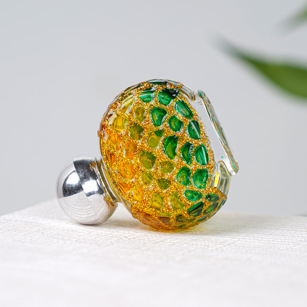 Buy a glass perfume bottle online that is a stunning piece of art crafted by highly skilled Indian craftsmen. Its unique design features a beautiful combination of green and yellow colours with golden sparkles intricately carved in the glass. The silver colour knob adds a touch of elegance to this designer perfume bottle, making it a perfect addition to any home decor. This bottle can be used for storing perfume or oil and is a great choice for those looking for empty perfume bottles online. The intricate design on the bottle is a testament to the craftsmanship of the artisans who have created it with utmost care and precision. It can be placed on a table or shelf for decoration, adding a touch of sophistication to any room. Moreover, it makes a lovely gift for family, friends, or relatives for special or festive occasions. In conclusion, this glass bottle is an epitome of luxury and beauty. Its intricate design, unique colour combination, and the silver knob make it a stunning addition to any collection of perfume bottles empty or otherwise.