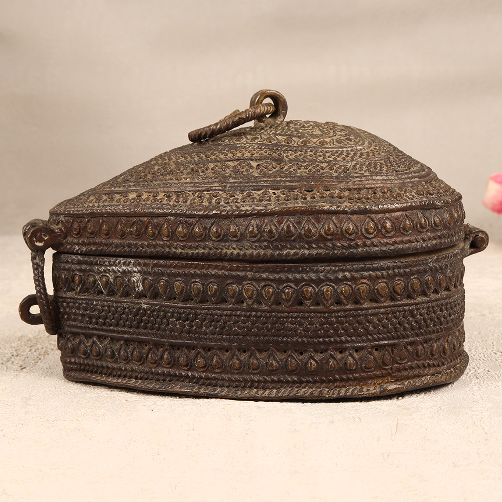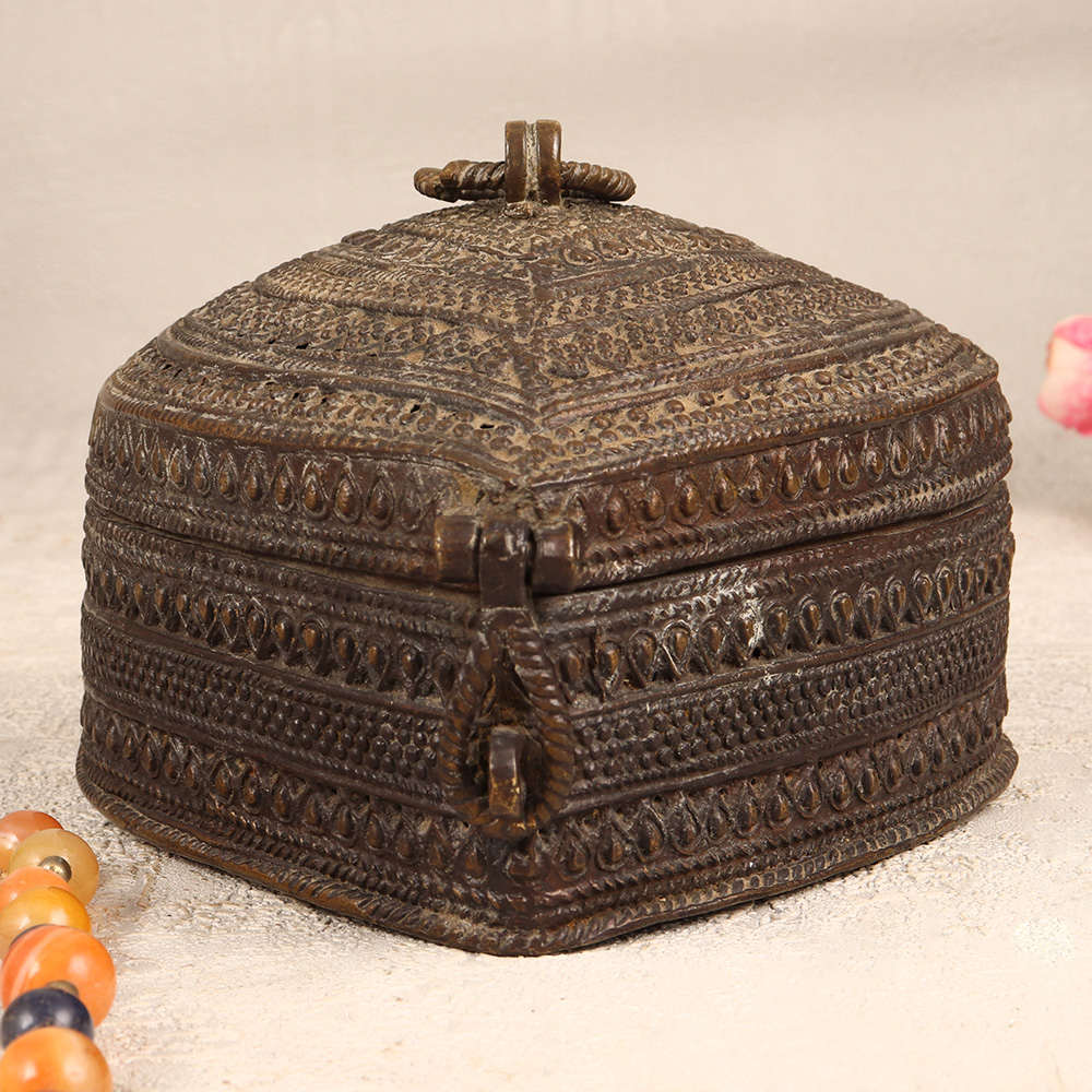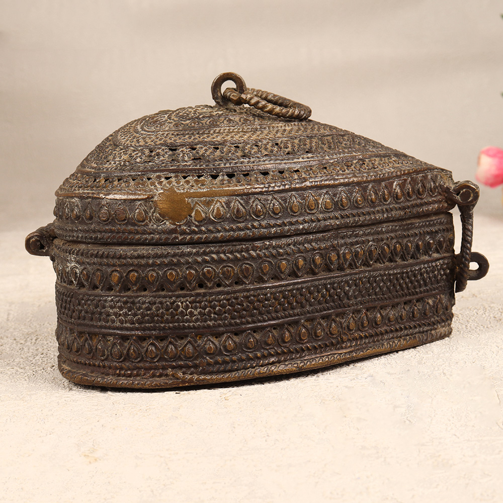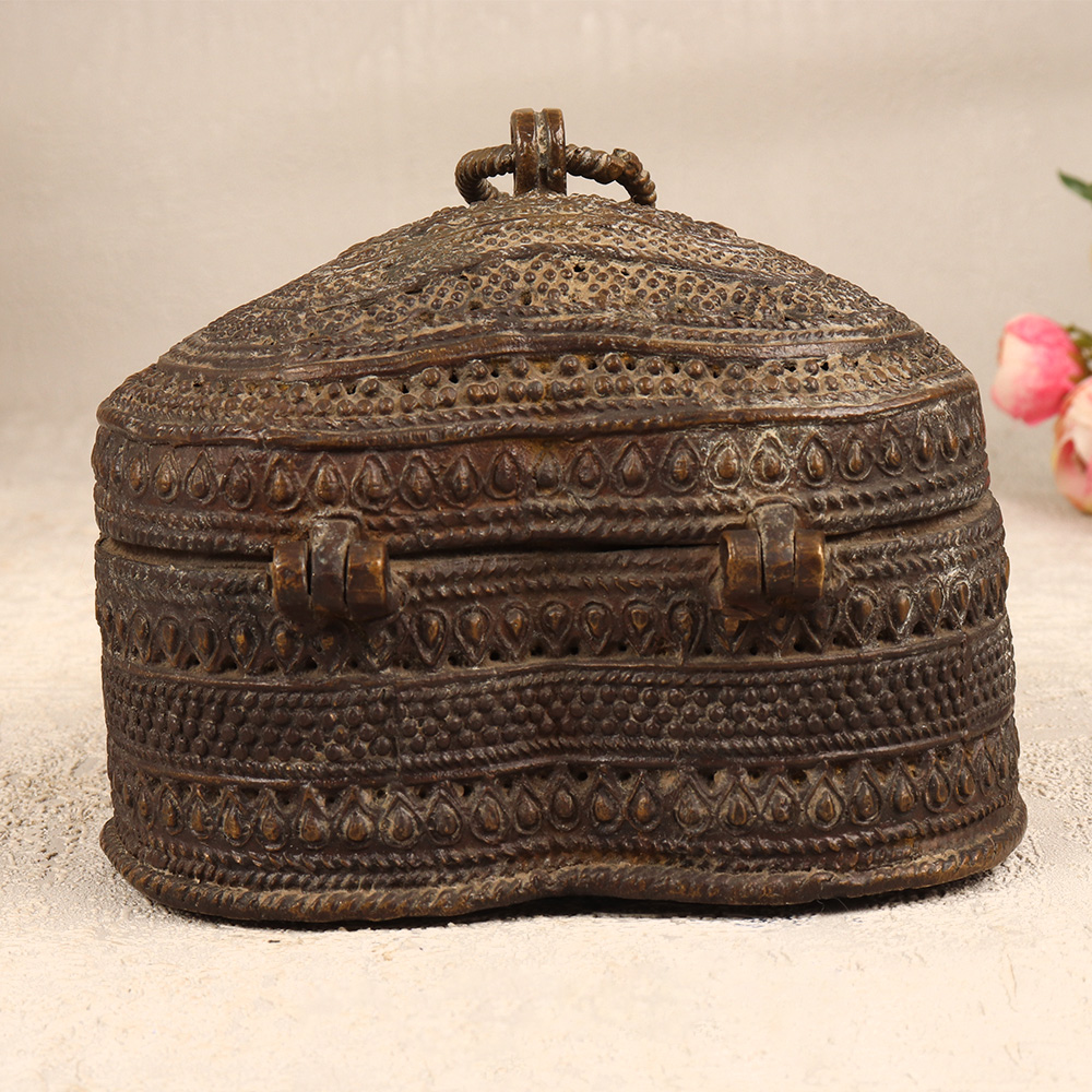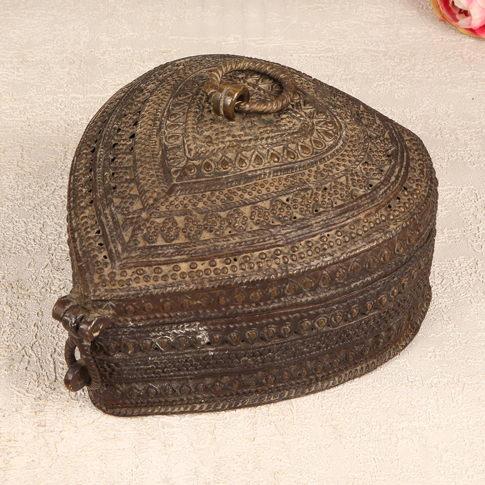 Enhance your treasures with the timeless allure of our Vintage Brass Heart-Shaped Jewelry Box that is a true testament to artistry and craftsmanship. Adorned with exquisite engravings, this piece is a masterpiece, handcrafted by highly skilled and experienced Indian artisans in the traditional Odisha Art style. The heart-shaped design adds a touch of romance, while the latch ensures the safety of your precious stones and jewelry. Embraced in an antique dark finish, this jewelry box exudes a rich, vintage charm, making it a versatile addition to any setting. Whether at home, office, restaurant, hotel, or cafe, its captivating presence enhances the ambiance with a touch of old-world elegance. This unique creation serves not only as a functional storage solution but also as a captivating decorative piece that beckons admiration. Ideal for collectors seeking to expand their vintage repertoire, this brass jewelry box is a statement of refined taste. As a thoughtful gift, it speaks volumes of love and appreciation, making it the perfect choice for special, festive, or auspicious occasions. Cherish the beauty of tradition and craftsmanship with this Vintage Brass Heart-Shaped Jewelry Box that is a testament to enduring style and sophistication.