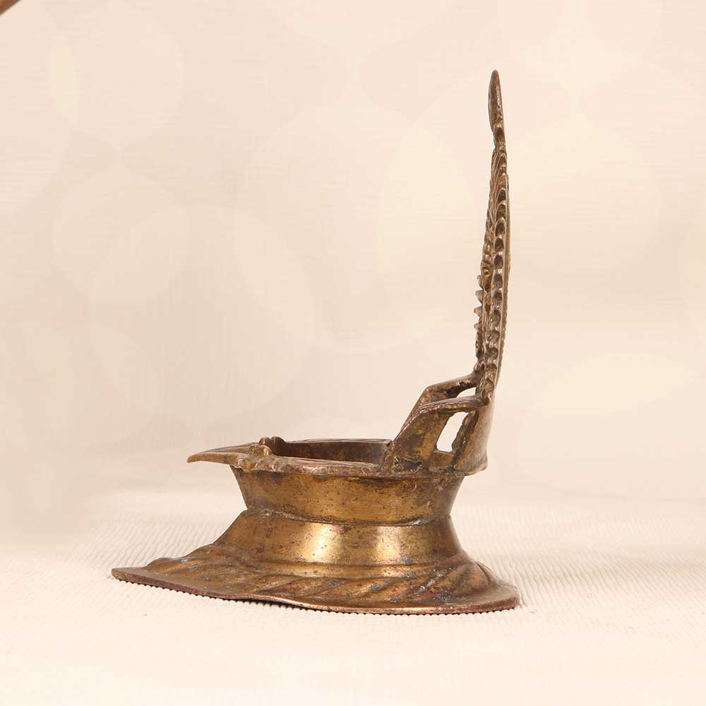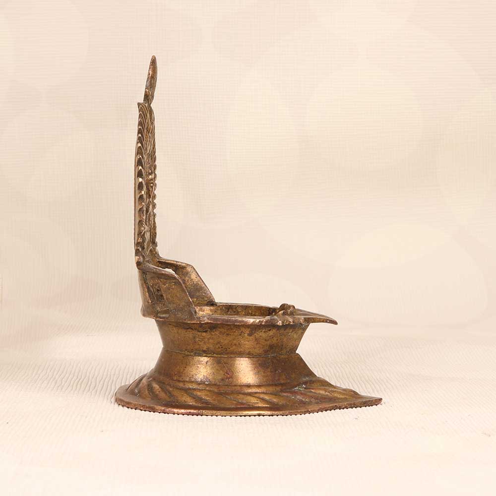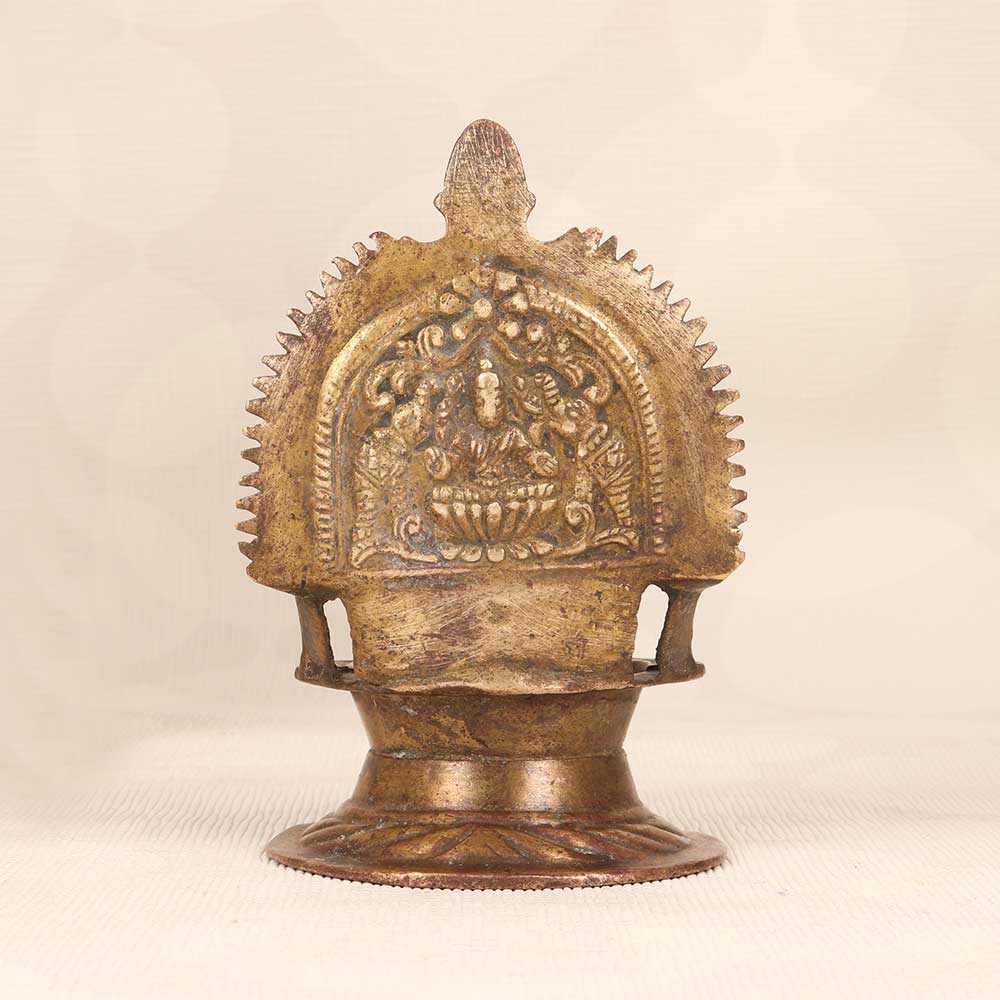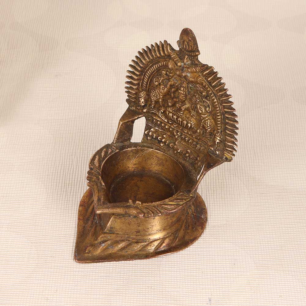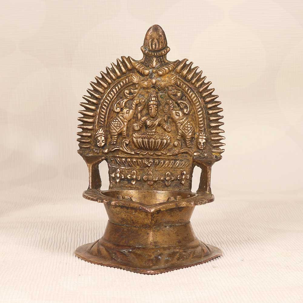 Unlock prosperity and abundance for your home with this vintage brass Gajlaxmi Oil Lamp in classic South Indian Art motifs. Featuring the benevolent goddess seated on her lotus, this lamp is decorated with ornate floral and peacock designs symbolizing grace and wisdom. Its wide, sturdy base and convenient handle provide stability and portability during use. When lit, the lamp's gentle flame will spread a tranquil aura in your home and usher in Lakshmi's blessings. Use it to light up puja rituals, or as part of your daily spiritual practice to channel positive energy. This handcrafted lamp combines divinity with beauty and makes a meaningful addition to any home. Bring it home and let Lakshmi's light shine on you.