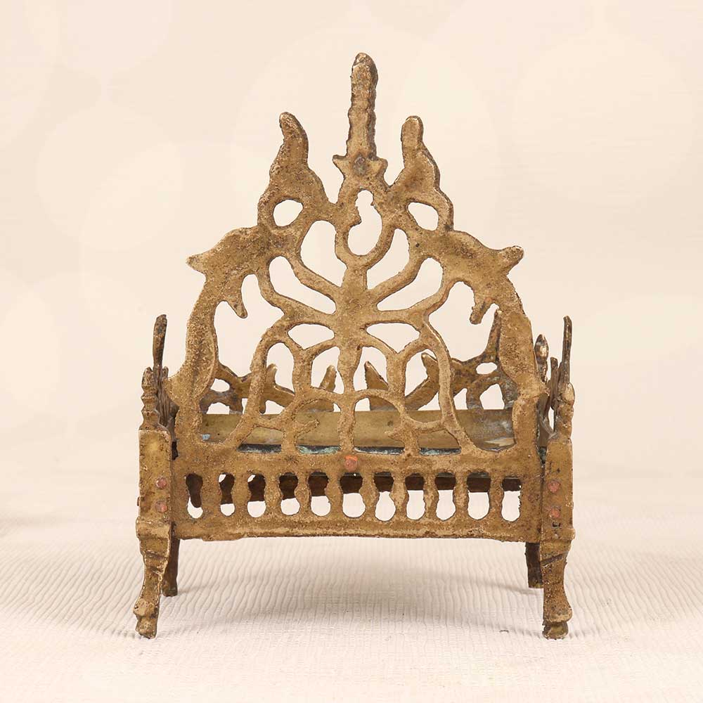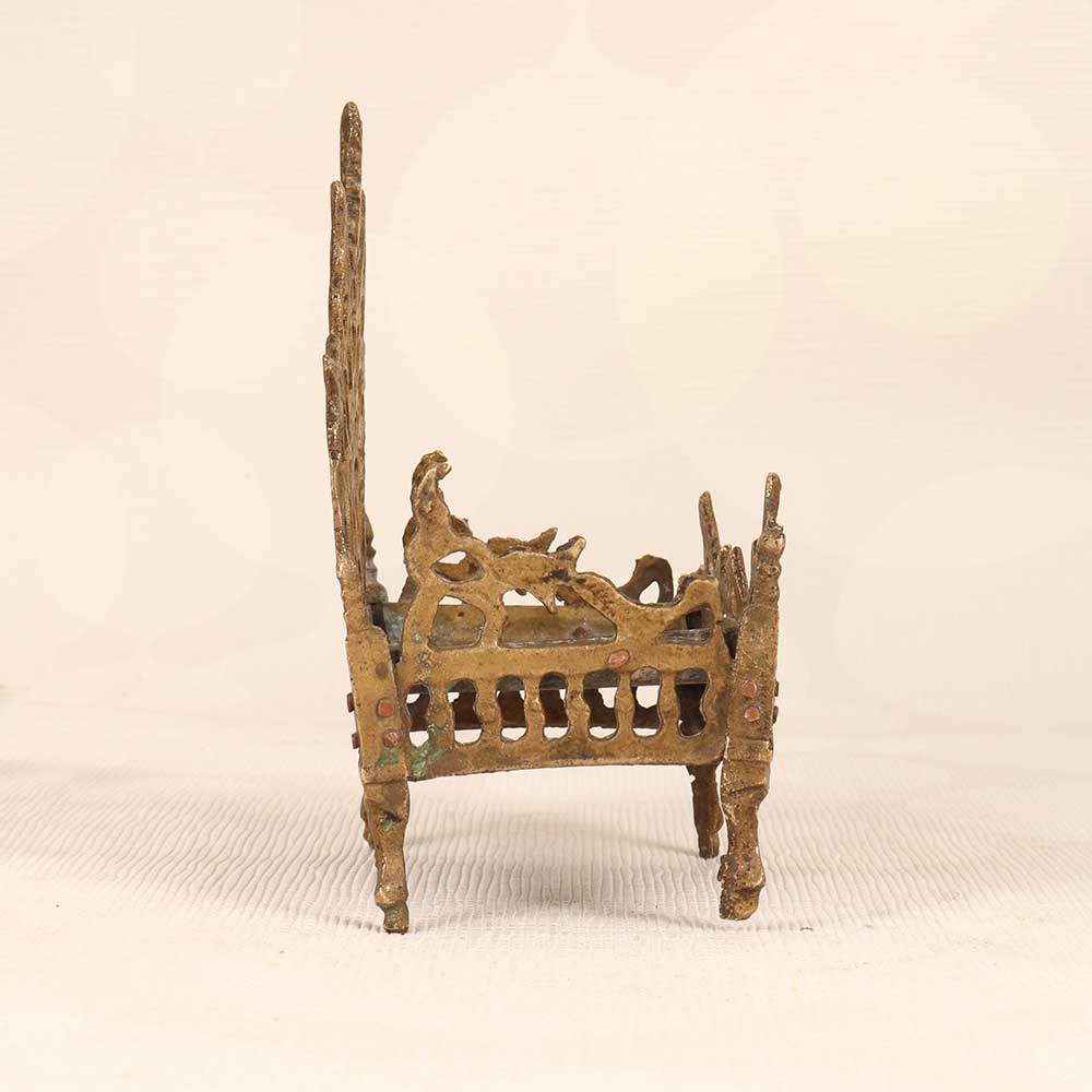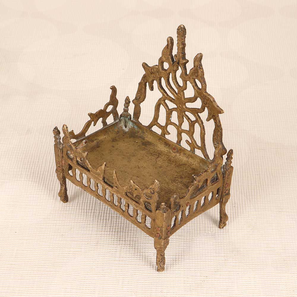 Find your inner peace as you drift off to sleep in this divine brass bed depicting Lord Krishna. Handcrafted by skilled artisans, its vintage design features intricate jali work that creates a tranquil aura. The jali work brings a textured elegance, while the brass material emanates warmth and opulence. It's perfect for those seeking a spiritual retreat right in their own home. Make each night feel like an escape to a peaceful ashram with this one-of-a-kind Lord Krishna brass bed. It's craftsmanship and divine motif will upgrade your sleep experience.