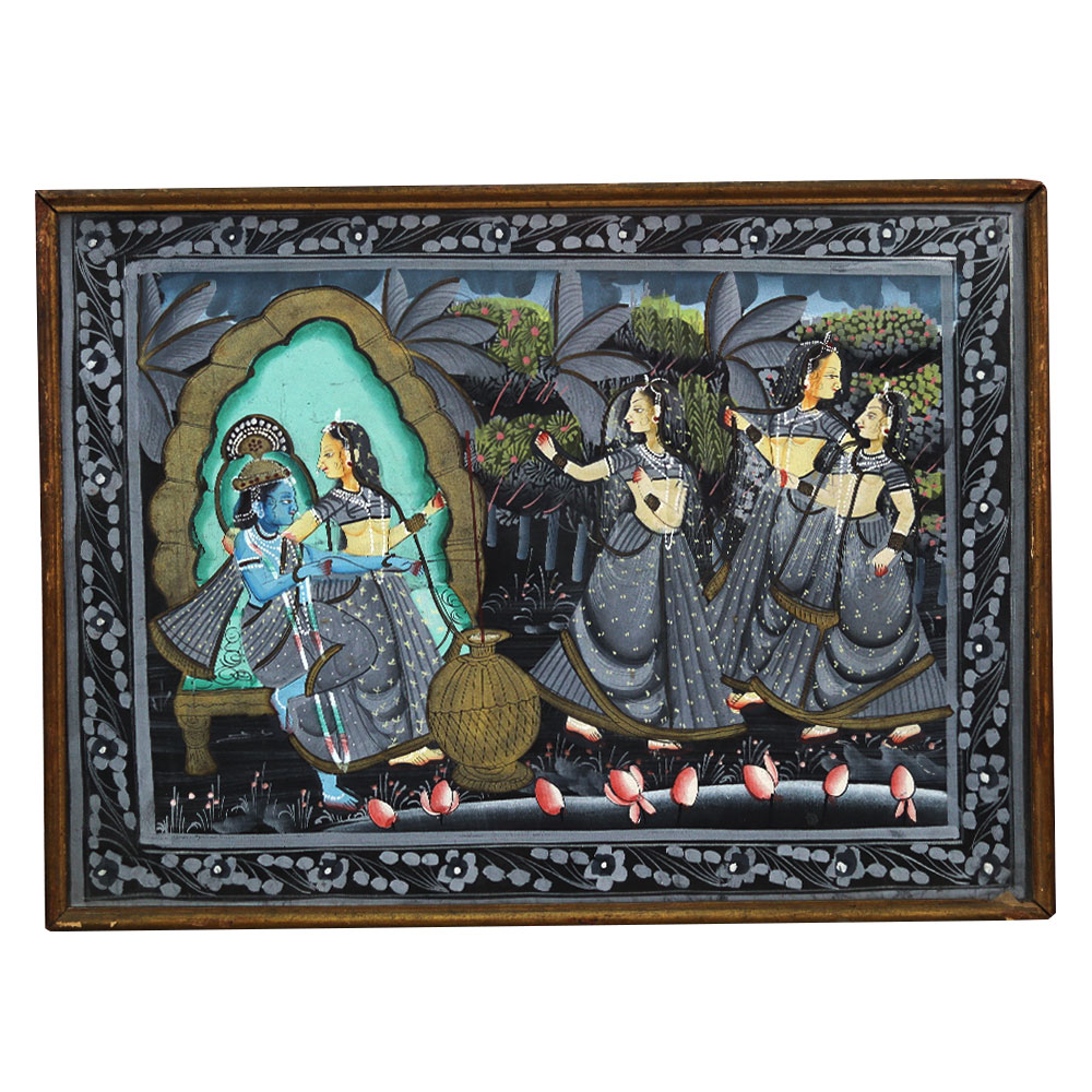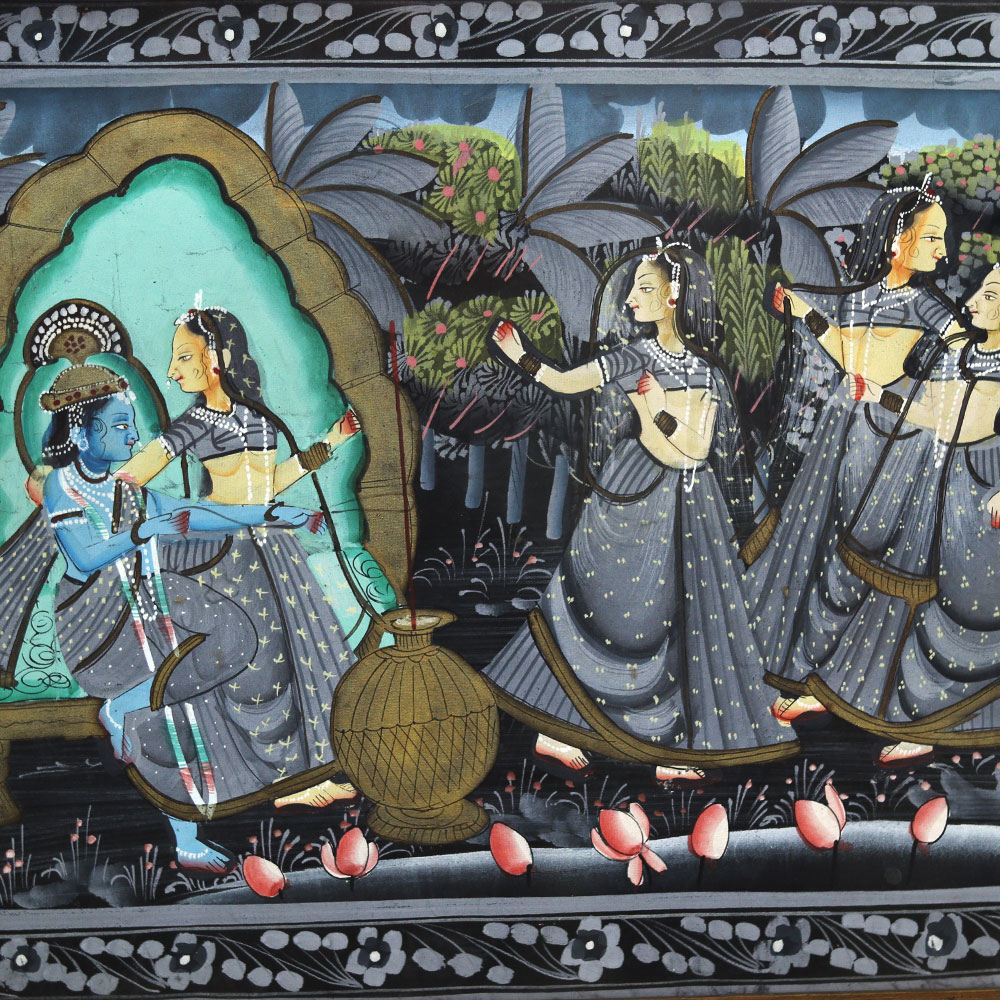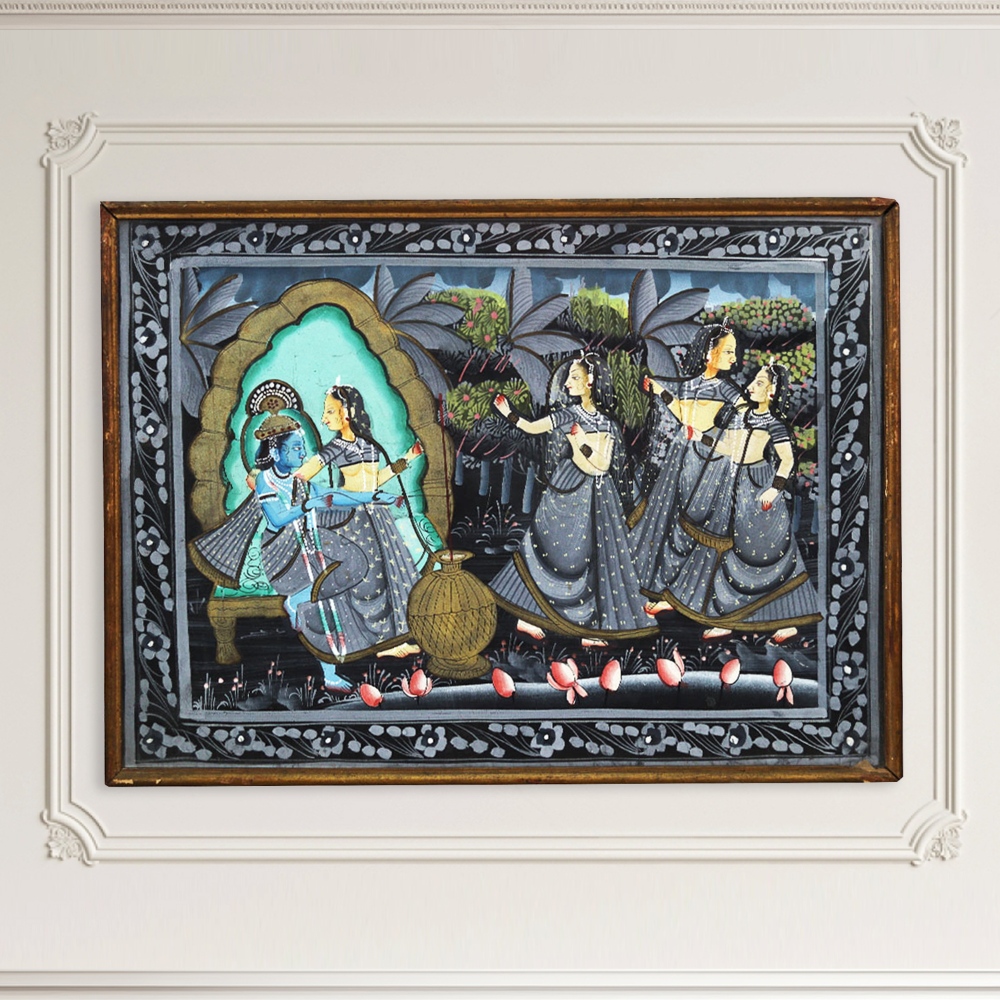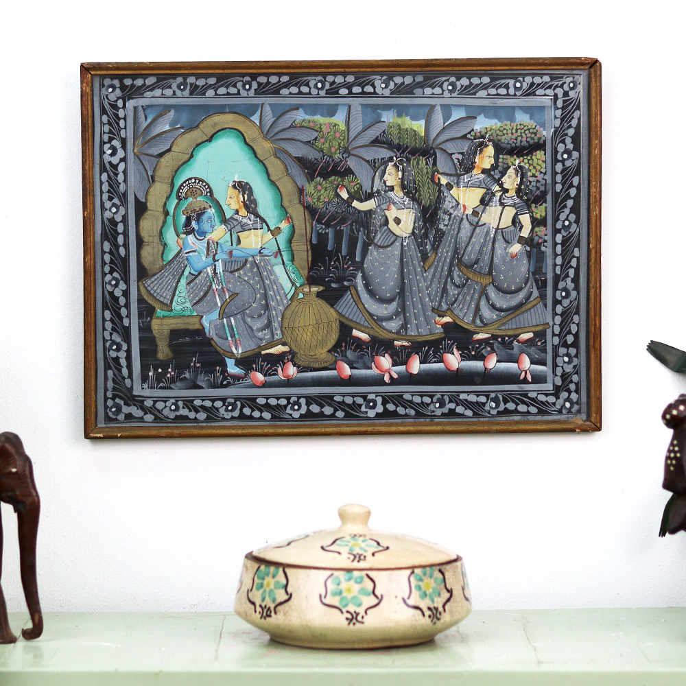 Step into the vibrant and captivating world of Rajasthani art with this used cloth painting that masterfully depicts the beloved Lord Krishna surrounded by his devoted Gopies. Crafted with the utmost care and attention to detail, this piece offers a glimpse into the rich cultural heritage of India's royal state. This cloth painting is a true testament to the enduring artistry of Rajasthan, where the divine dance of Lord Krishna and his Gopies is celebrated through the skilled hands of local artisans. Immerse yourself in the serene and joyful atmosphere that emanates from this masterpiece, as the Lord's gentle presence and the Gopies' playful movements captivate the senses. Whether you are a seasoned collector or simply someone drawn to the enchanting aesthetics of Indian art, this used cloth painting is a must-have addition to your collection. Display it with pride, allowing its captivating energy to inspire and uplift you every day. Embrace the opportunity to own a piece of Rajasthan's artistic legacy and let it become a cherished centerpiece in your home.