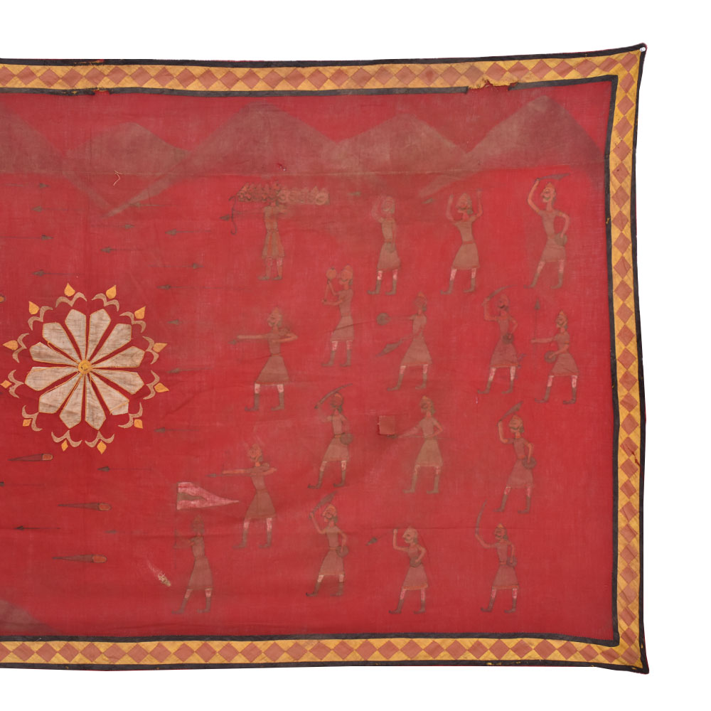 An incredible pichwai painting on fabric cloth that depicts a scene of a fierce war between tribal groups, with a stunning flower design at the center of the composition. The red background of the painting intensifies the drama of the battle, creating a sense of urgency and danger. The painting has been intricately painted by professional Indian artists in a variety of colours, creating a mesmerizing visual spectacle. This pichwai painting is perfect for adorning your prayer room or temple, adding an auspicious touch to your sacred space. It can also be an excellent gift for your family, friends, or relatives during special or festive occasions. Pichwai paintings are a unique and ancient art form that originated in the temples of Rajasthan, India. They are known for their intricate designs, vibrant colours, and spiritual themes. This painting, in particular, captures the essence of the tribal culture and their struggles, while also highlighting the beauty and power of nature through the central flower design. Overall, the pichwai painting on fabric cloth is a beautiful and meaningful addition to any home or sacred space, serving as a constant reminder of the rich artistic and cultural heritage of India.