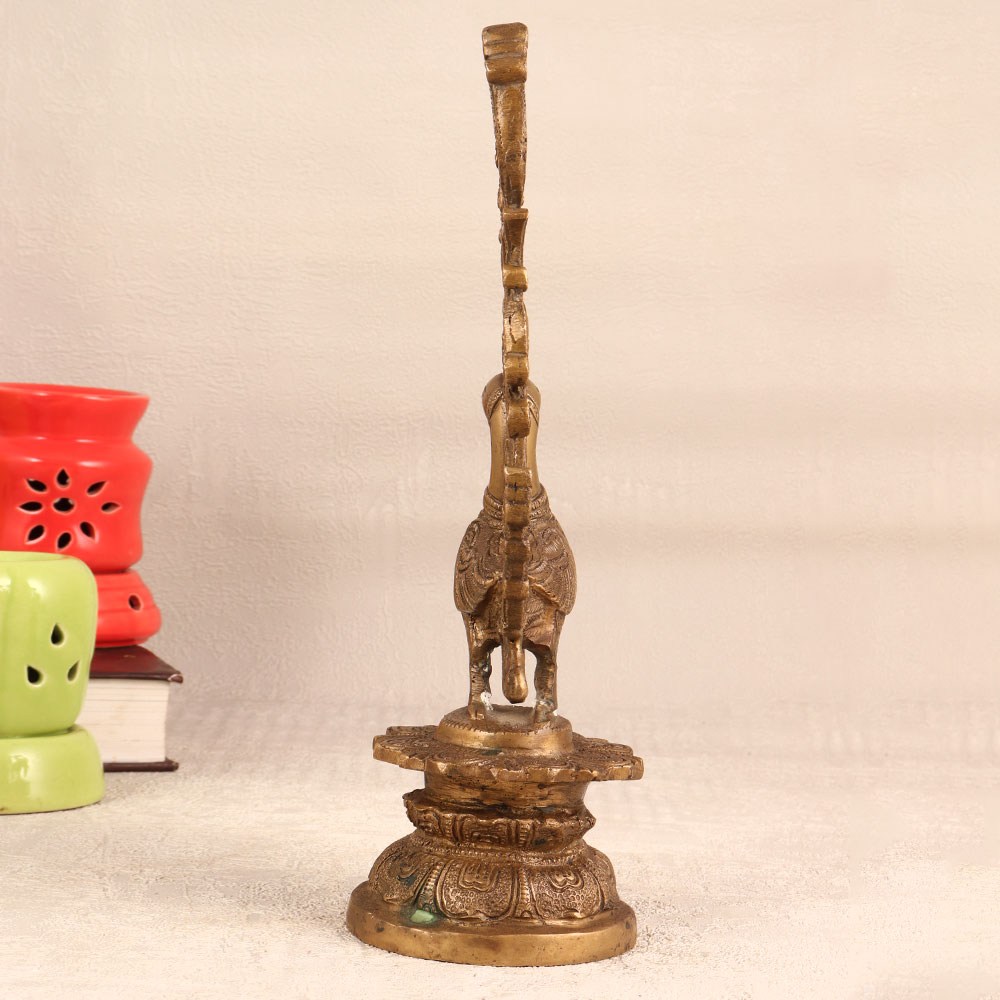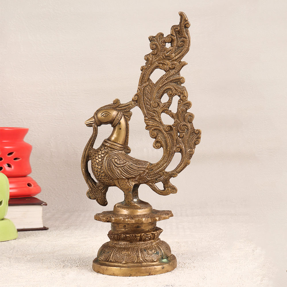 Enhance your decor with the exquisite charm of our brass peacock statue on stand which is a masterpiece meticulously crafted by professional Indian artisans in the timeless tradition of South Indian Art. This stunning piece features a captivating peacock, a symbol of grace and beauty, rendered in high-quality brass with an antique brown finish that adds a touch of vintage allure. Handmade with precision and passion, this peacock statue stands as a testament to the rich artistic heritage of India. Its intricate detailing and craftsmanship make it a remarkable addition to any space, be it your home, office, restaurant, hotel, or cafe. The statue's versatile design allows it to seamlessly blend with various interior styles, adding a touch of sophistication and cultural richness. Beyond its aesthetic appeal, this brass peacock statue serves as a meaningful gift for your family, friends or relatives on special, festive, or auspicious occasions. Embrace the opportunity to share the artistry and cultural significance embodied in this piece, making it a cherished token that transcends mere decoration to become a symbol of lasting connection and appreciation for the finer things in life. Start or enhance your vintage collection with this timeless masterpiece that brings the essence of South Indian artistry into your surroundings.
